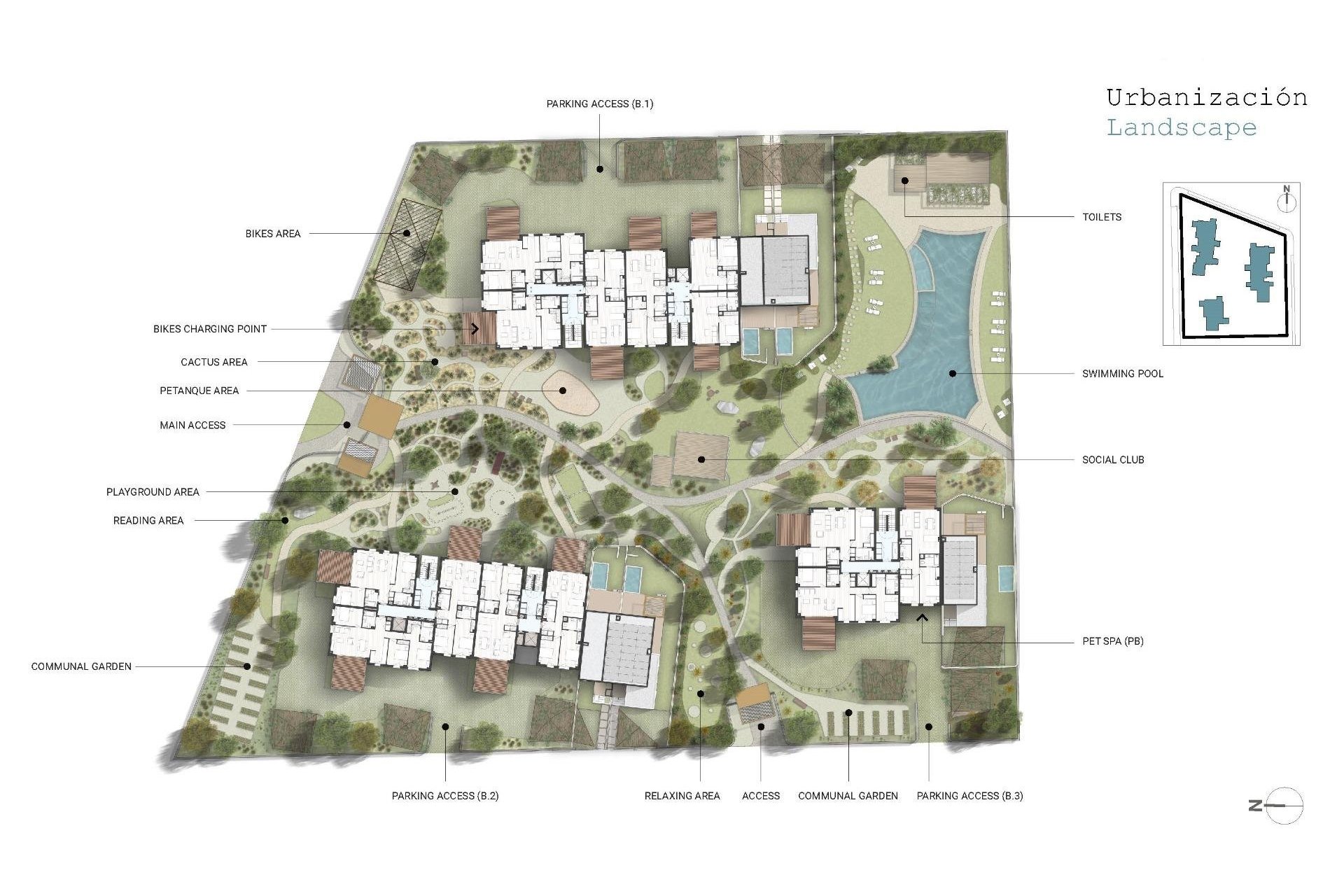 ¿Y qué más? Tome nota: amplias y numerosas piscinas repartidas por toda la urbanización, jardines sensoriales, espacios para la práctica del yoga, huertos de autoconsumo, talleres de bicicletas y zonas de lavado de mascotas.