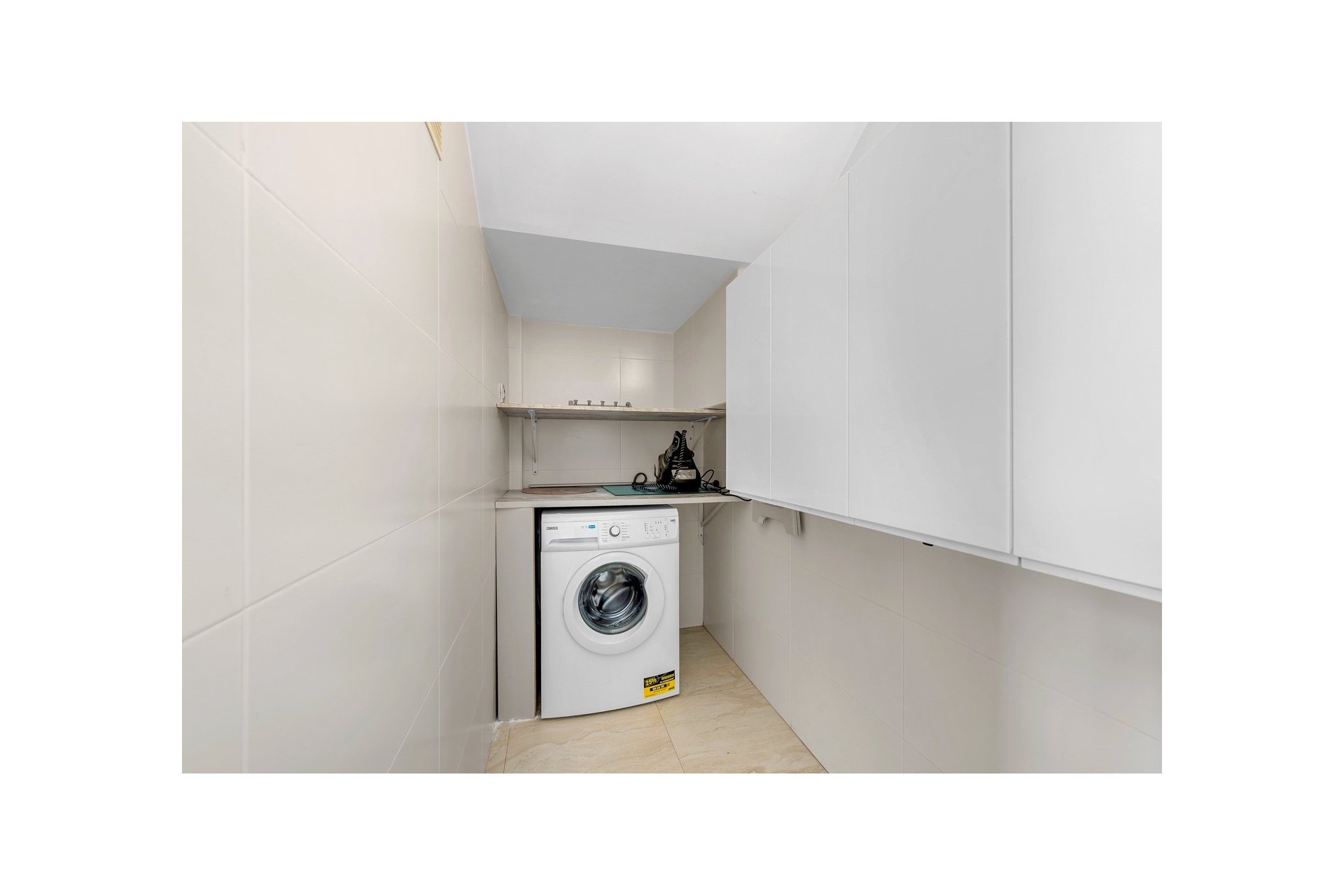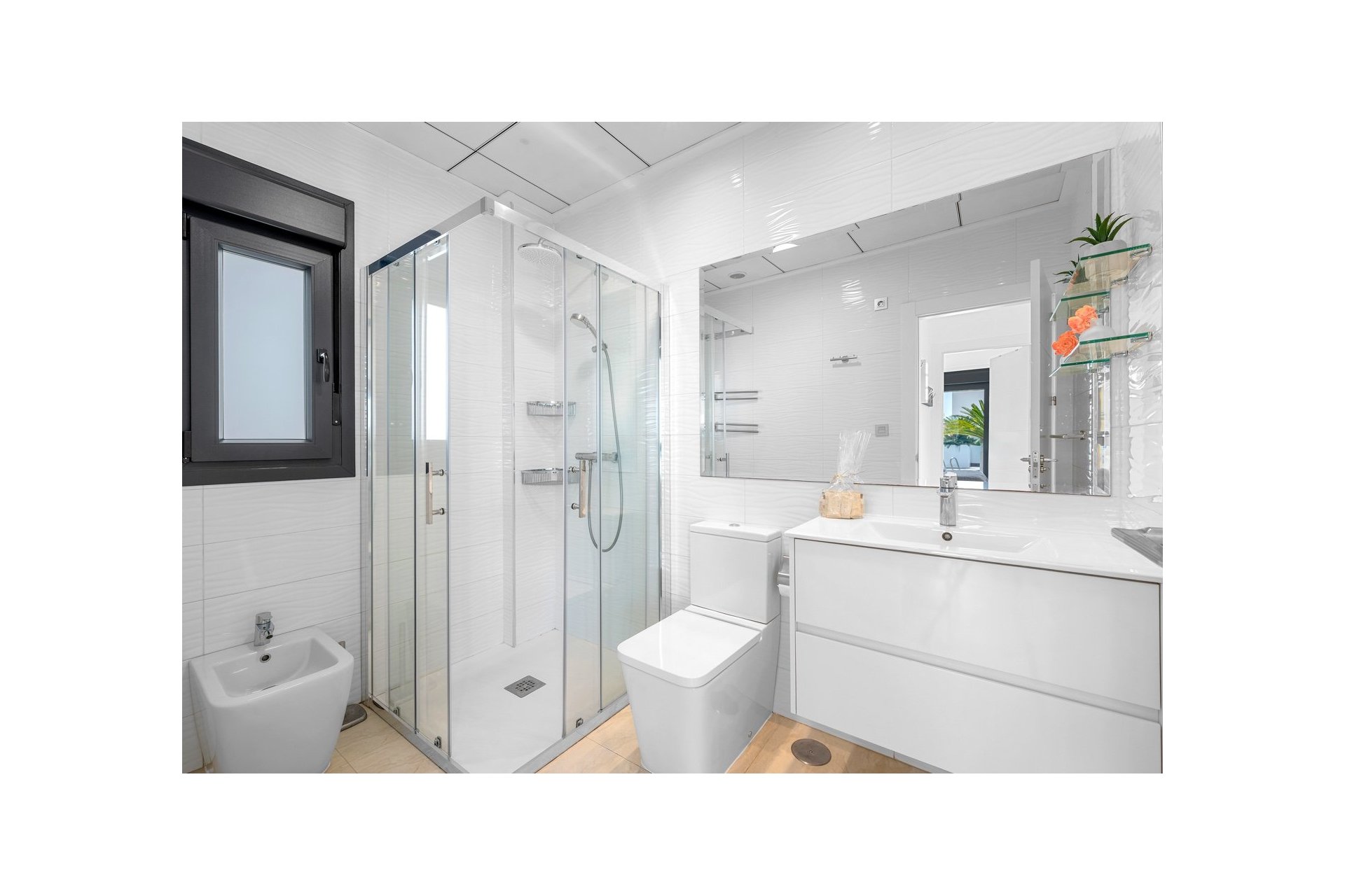 La villa cuenta con tres amplios dormitorios, todos ellos con armarios empotrados, y dos baños completos, uno de ellos en suite dentro del dormitorio principal. La cocina, de estilo abierto, se integra perfectamente con el comedor y el salón, creando una zona de día luminosa y acogedora, con acceso directo a la terraza y la piscina. También dispone de un práctico cuarto de lavandería independiente.