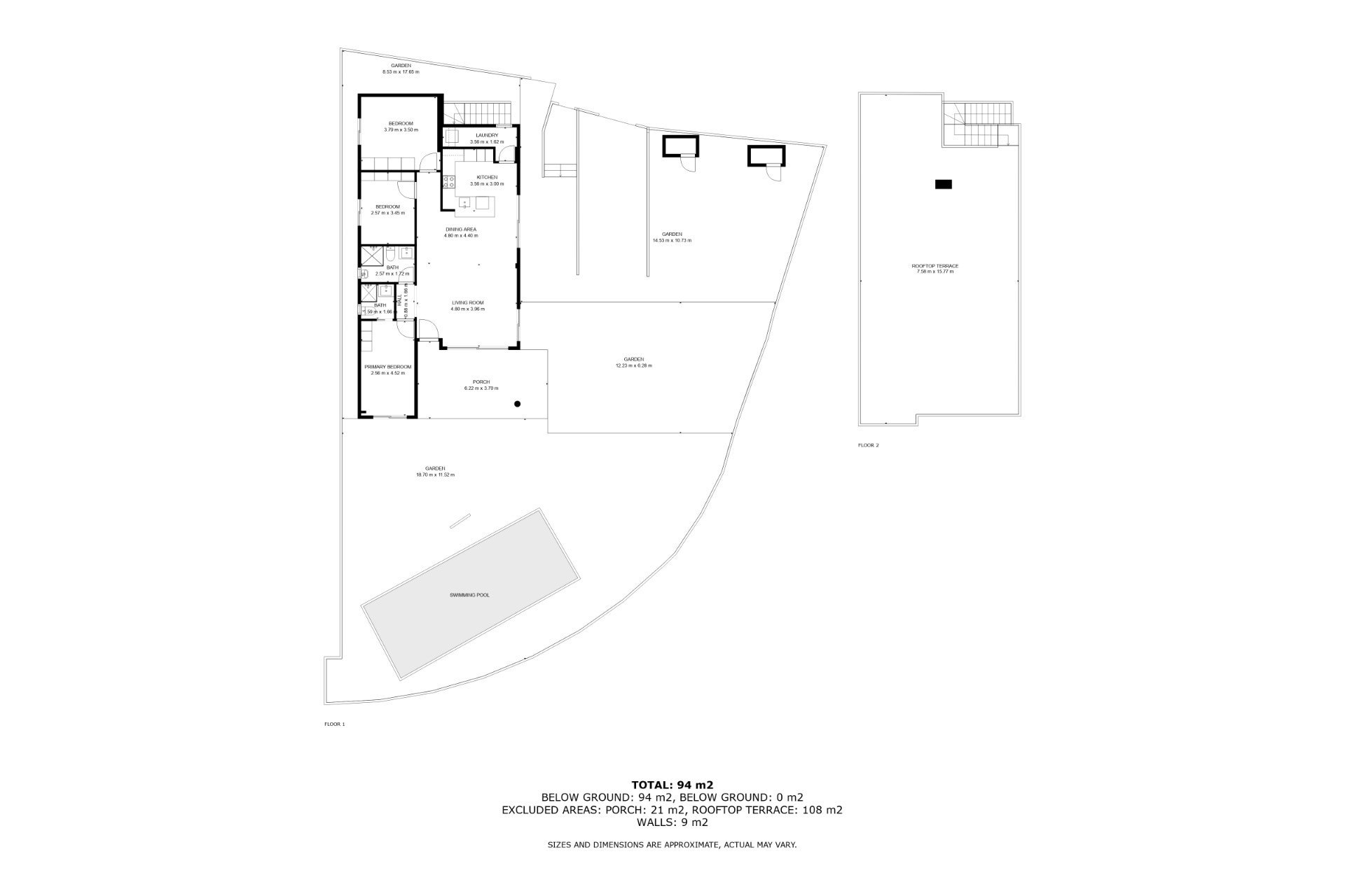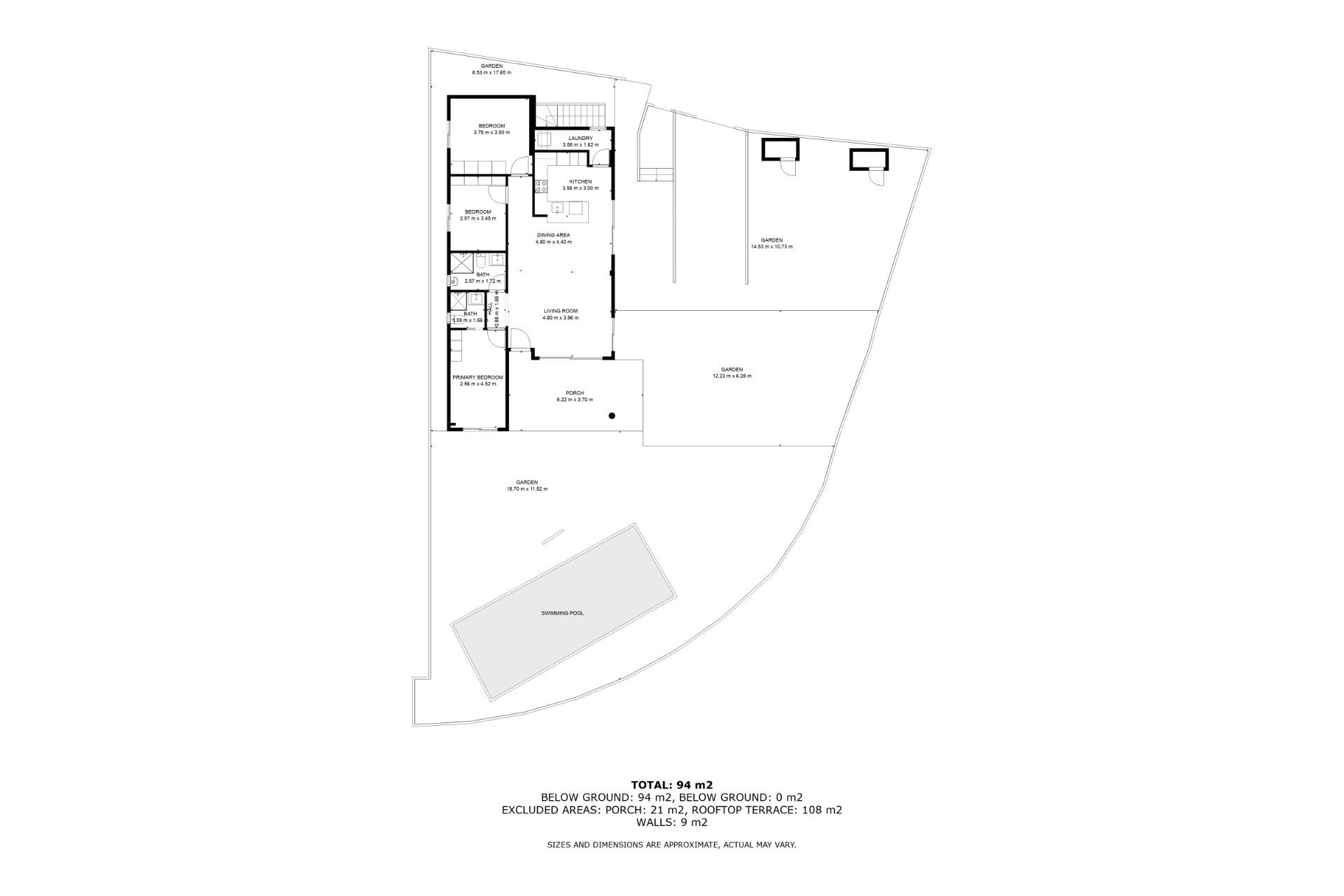 El exterior de la vivienda destaca por su piscina privada rodeada de zonas ajardinadas de fácil mantenimiento, una terraza cubierta ideal para comidas al aire libre, un comedor exterior con pérgola y césped artificial, así como un amplio solárium en la azotea. Además, la propiedad ofrece aparcamiento dentro de la parcela, incluyendo un carport cubierto.