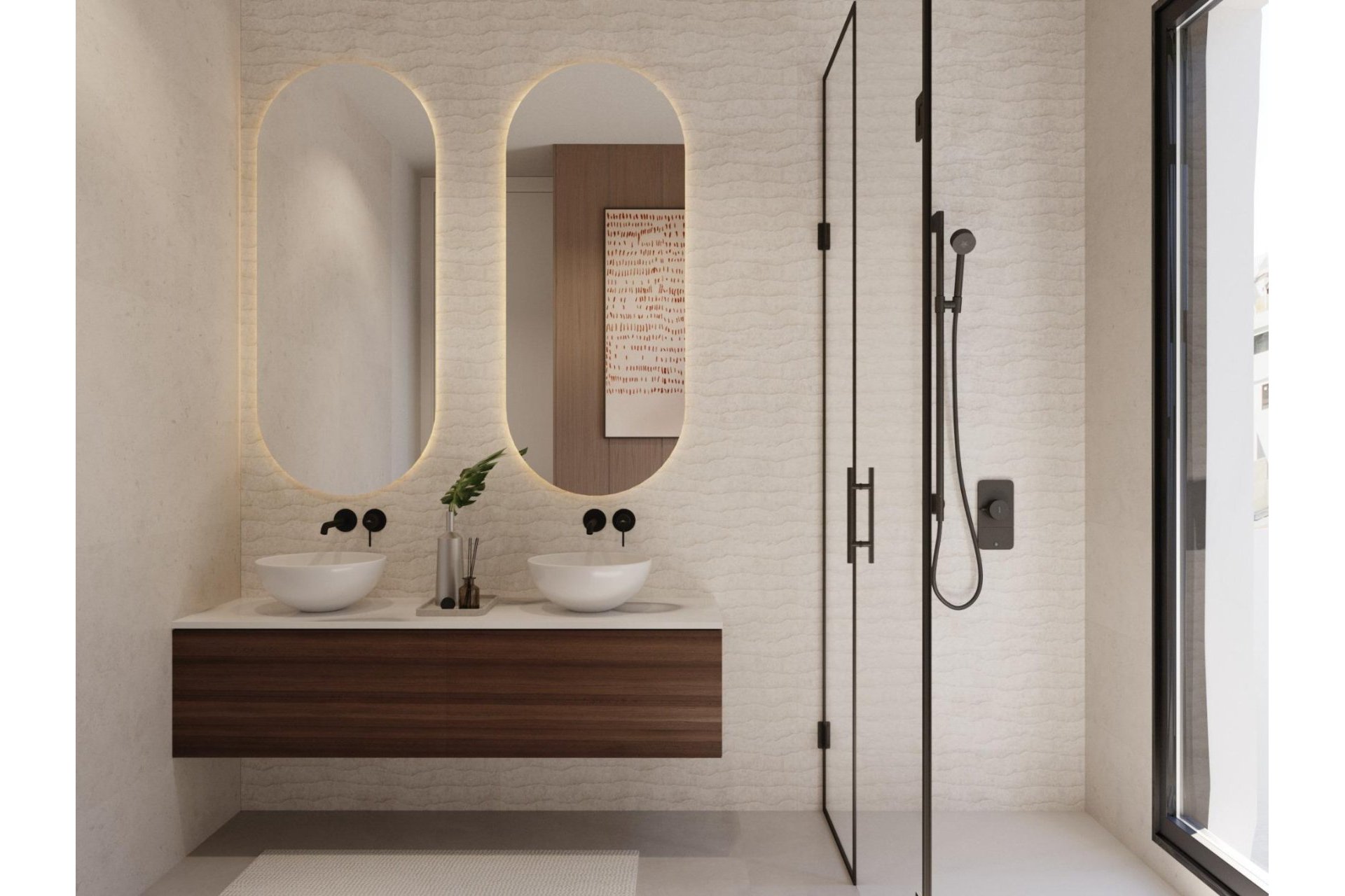 Baños completamente equipados con muebles, espejos y duchas a ras de suelo con mamparas