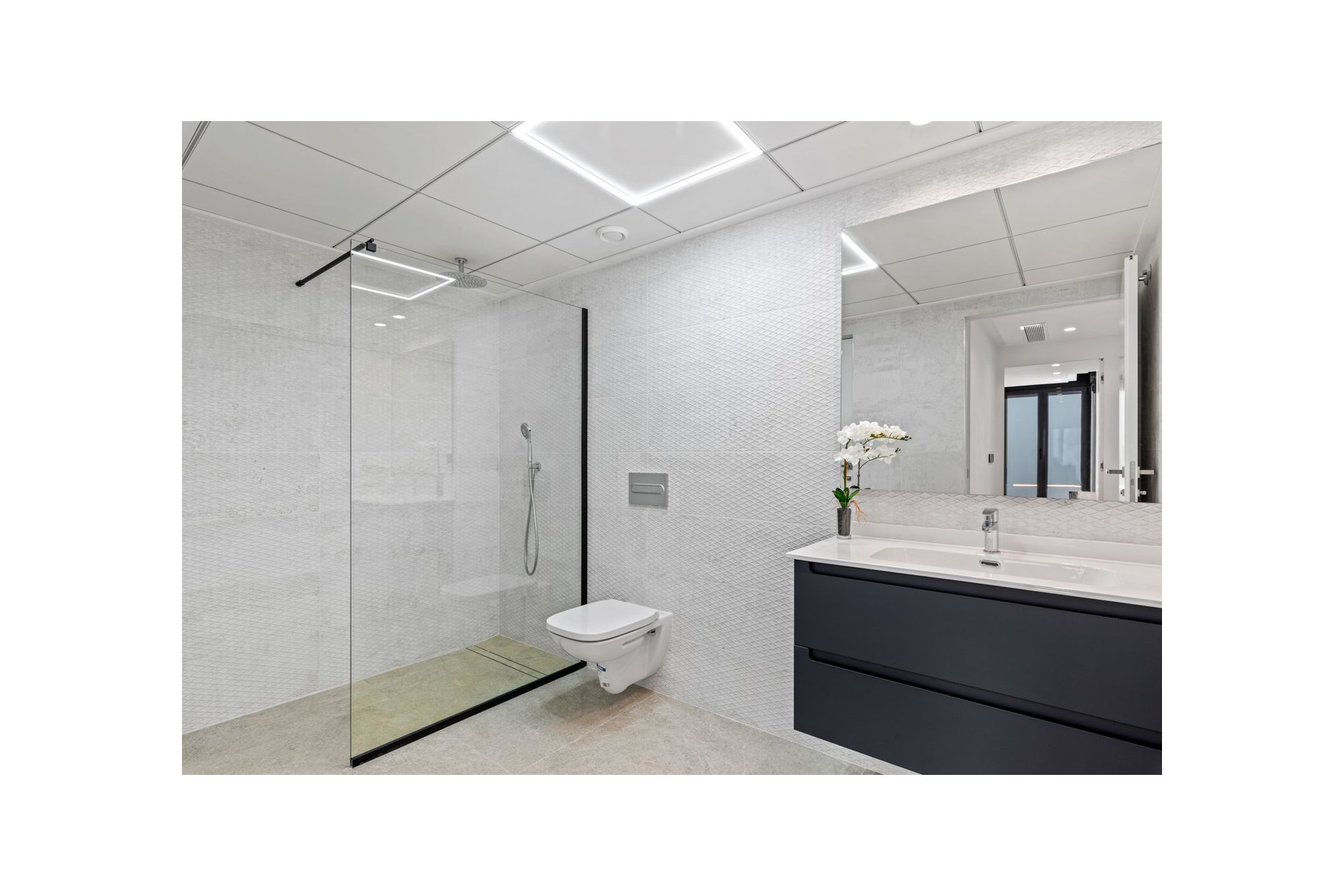 Consta de 3 amplias habitaciones con armarios empotrados, 2 baños y un aseo de invitados. En la primera planta hay una gran terraza para disfrutar. Todos los materiales son de alta calidad y diseño moderno, con puerta de seguridad, jardín totalmente terminado con terraza, persianas eléctricas, carpintería exterior de aluminio, ventanas de doble acristalamiento, calefacción por suelo radiante, etc.