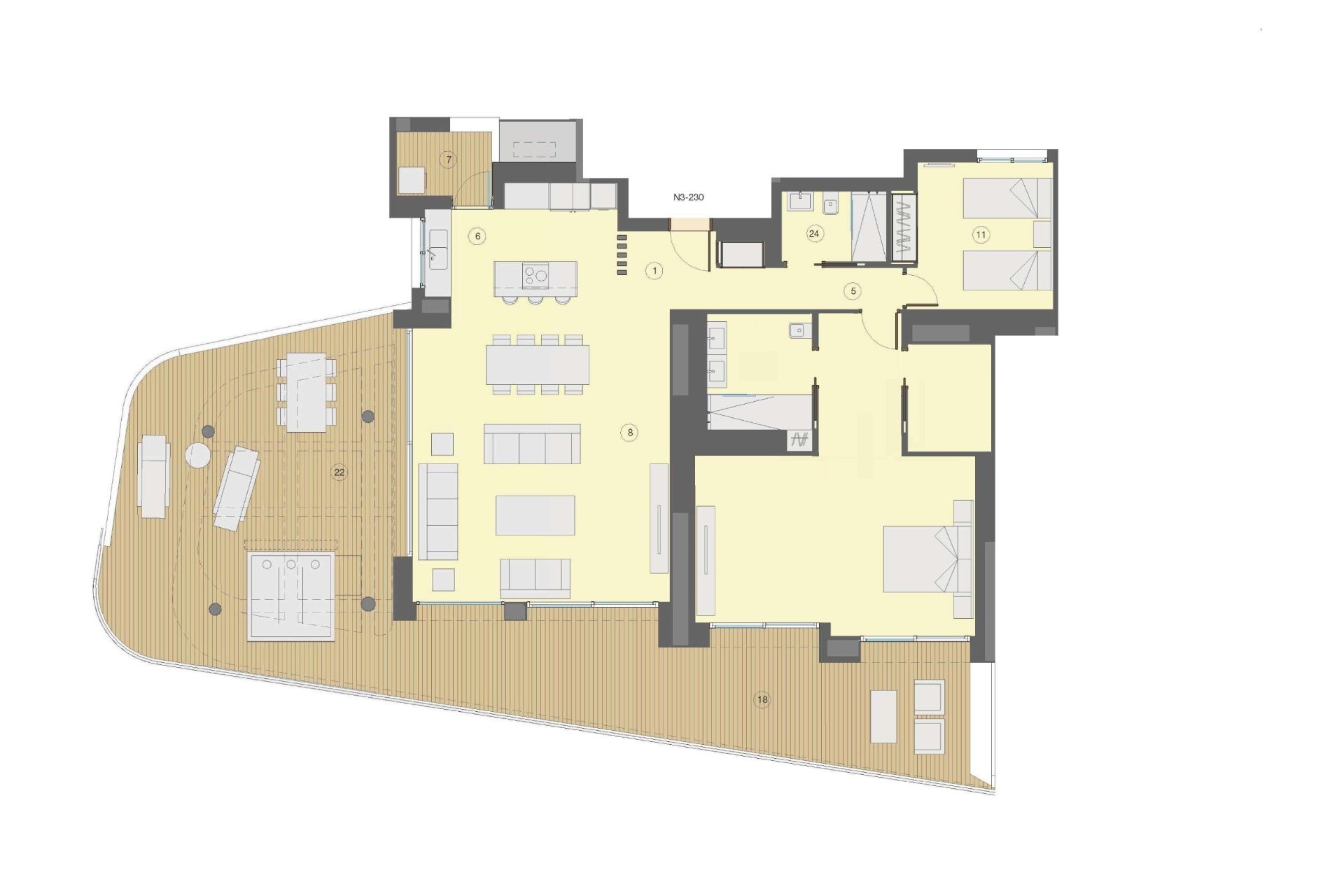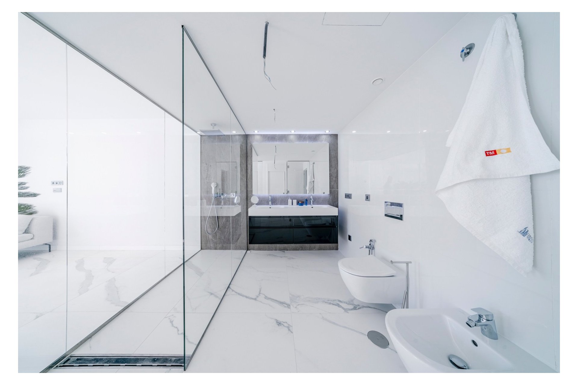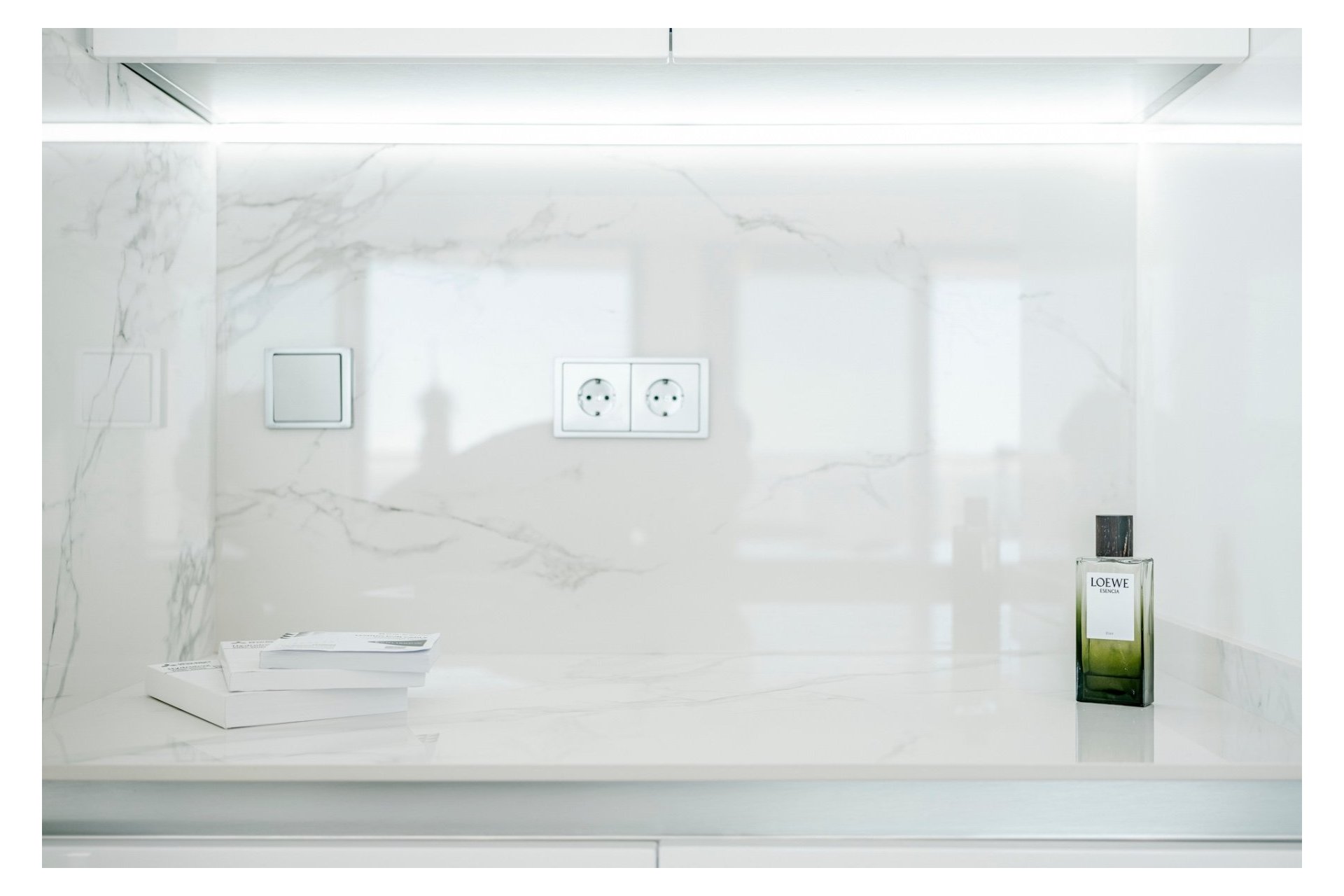 La amplia sala de estar está bañada por la luz natural, con una cocina de concepto abierto equipada con electrodomésticos inteligentes Samsung de alta gama y acabados exclusivos de Porcelanosa. Con su diseño impecable y materiales de primera calidad, este espacio es perfecto tanto para la vida cotidiana como para el entretenimiento.