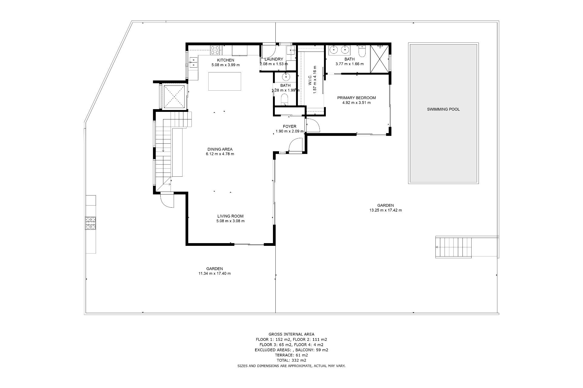W ogrodzie znajduje się prywatny basen z wodospadem, jacuzzi i hydromasażem. Przestrzeń wokół basenu jest zadbana, ozdobiona dużą ilością roślinności. Obok basenu znajduje się prysznic na świeżym powietrzu. Wreszcie, na terenie działki znajduje się również parking na kilka samochodów.
