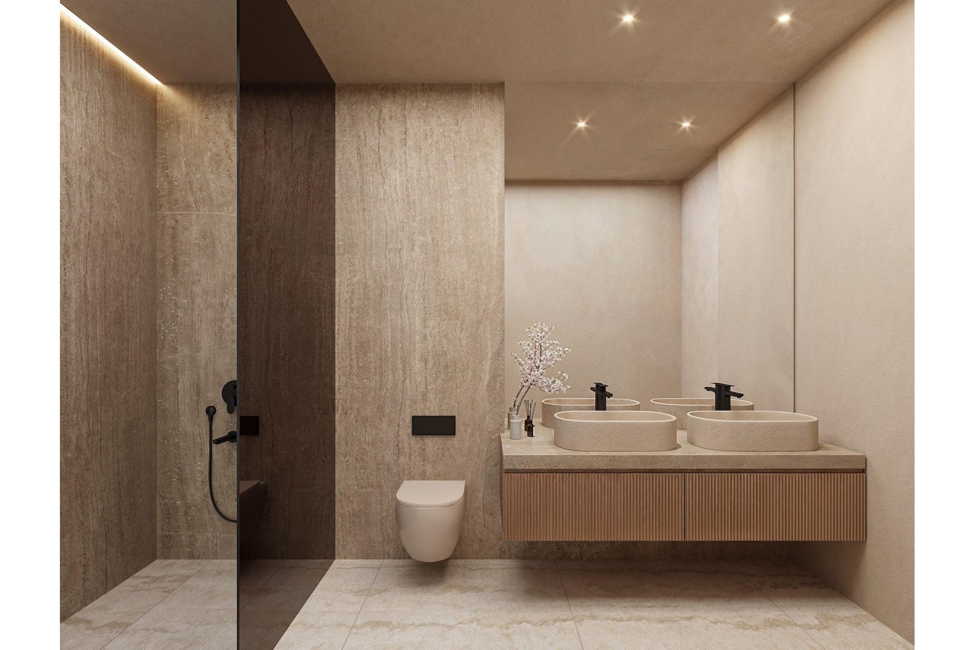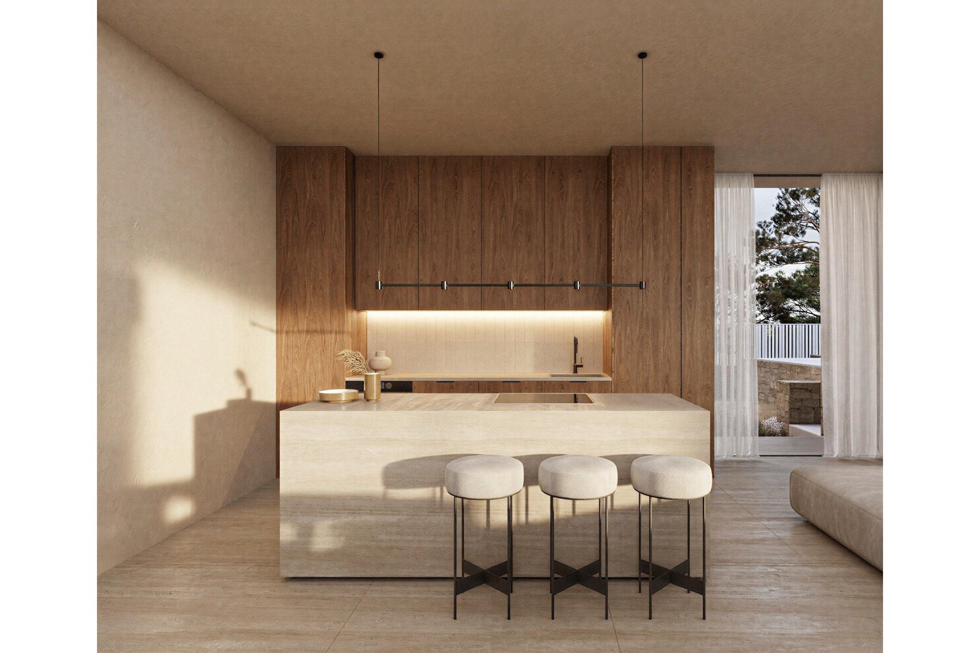Łącząc śródziemnomorskie ciepło z nowoczesną elegancją, architektura łączy naturalny kamień, drewno i delikatne neutralne odcienie, płynnie wtapiając się w nadmorski krajobraz.