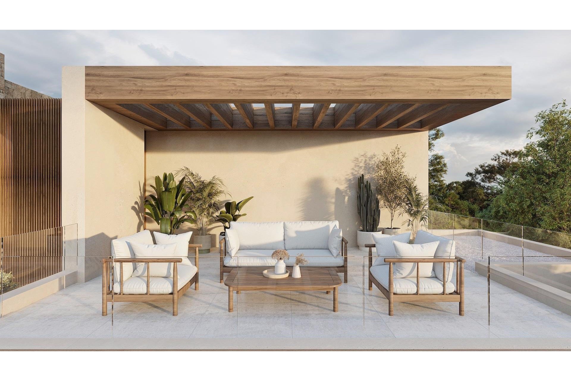 Dwie sypialnie dwuosobowe, w pełni wyposażona łazienka i toaleta dla gości uzupełniają tę kondygnację, zapewniając komfort i funkcjonalność. Na zewnątrz drewniana pergola zapewnia cień w salonie i jadalni na świeżym powietrzu, otoczonych bujnymi ogrodami, tarasami słonecznymi i basenem bez krawędzi o powierzchni 59,40 m², który wizualnie łączy się z morzem.