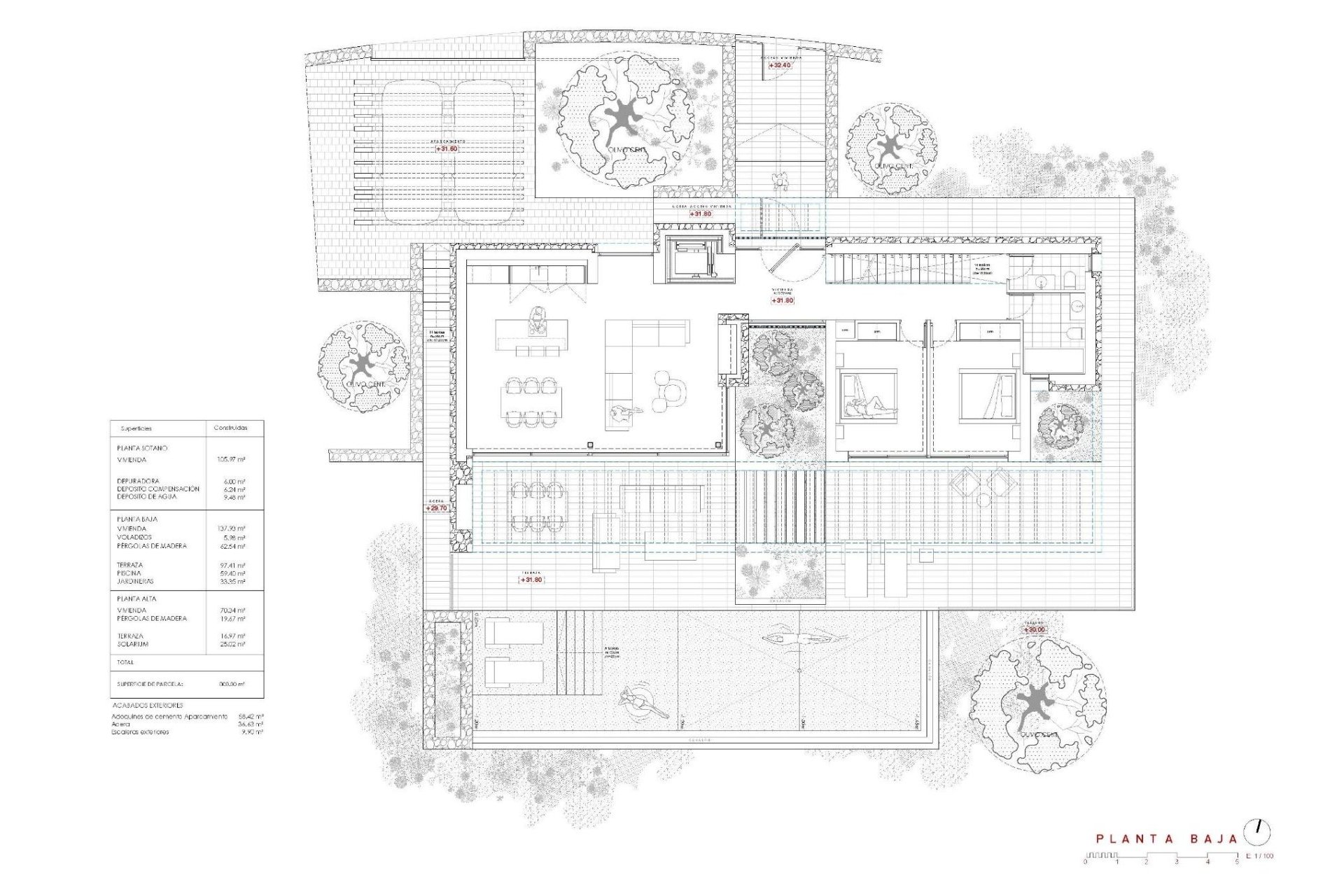 Ta ekskluzywna, nowo wybudowana willa, zaprojektowana przez znanego architekta i zrealizowana przez lokalnego dewelopera z ponad 20-letnim doświadczeniem, położona jest na działce o powierzchni 800 m², zaledwie kilka kroków od plaży La Fustera.