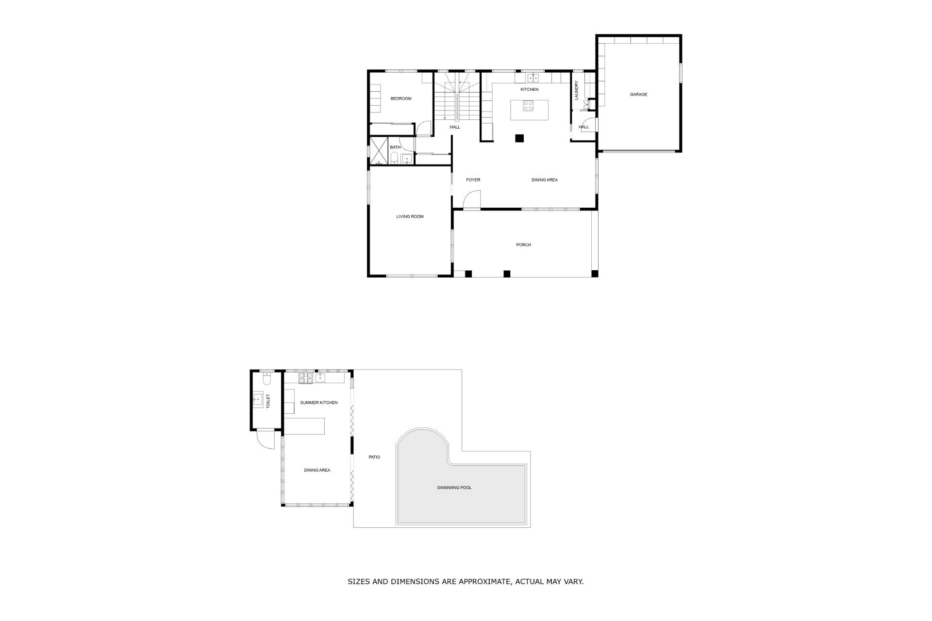 W ogrodzie znajduje się piękny basen, a obok niego kuchnia na świeżym powietrzu wyposażona w grill, zlew, lodówkę i szafki. Znajduje się tu również jadalnia. Za kuchnią zewnętrzną znajduje się łazienka dla gości.
