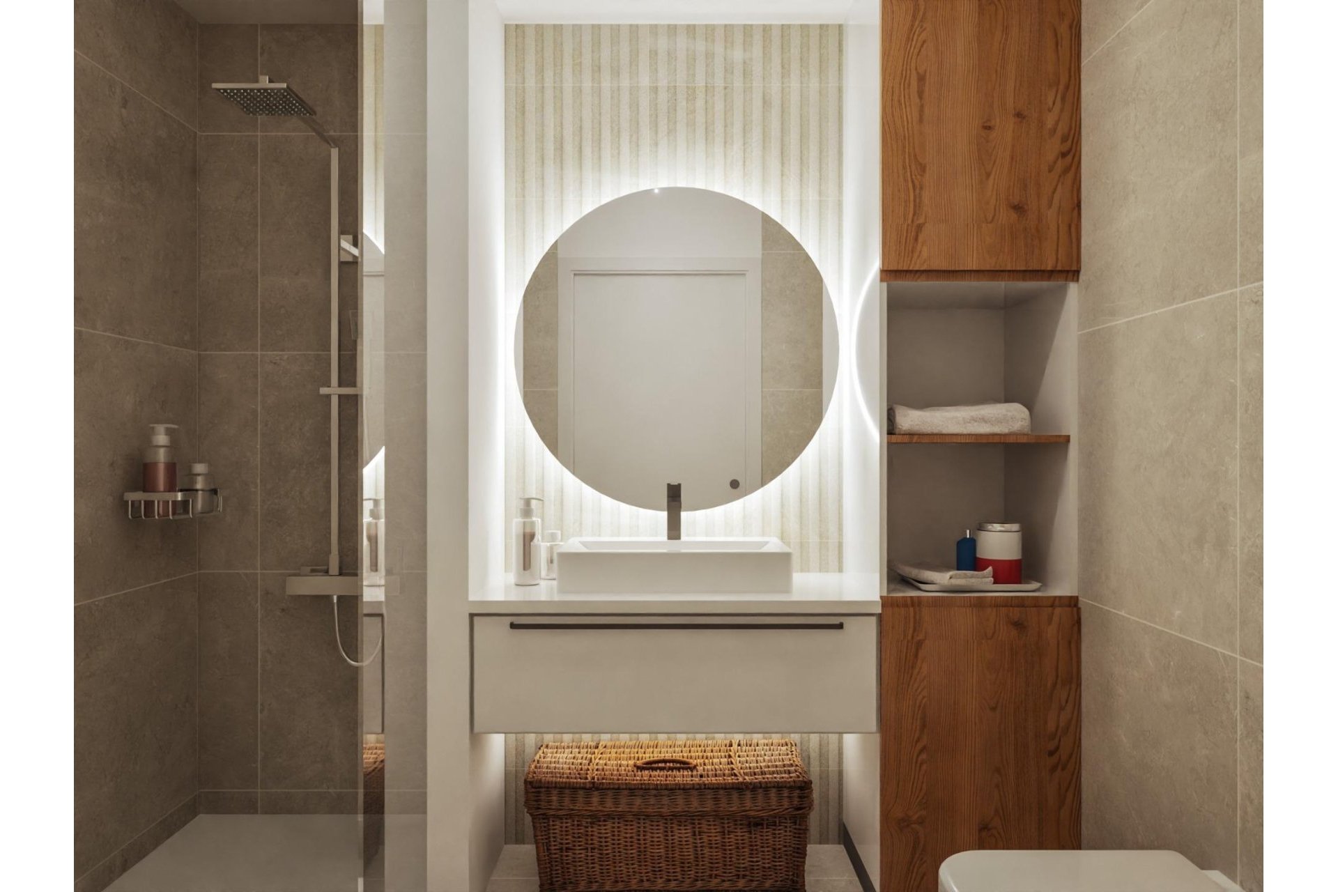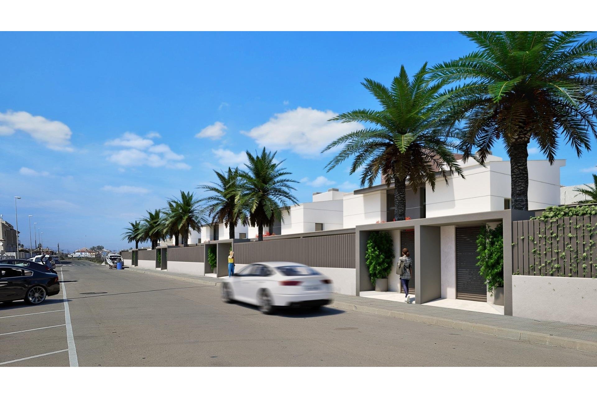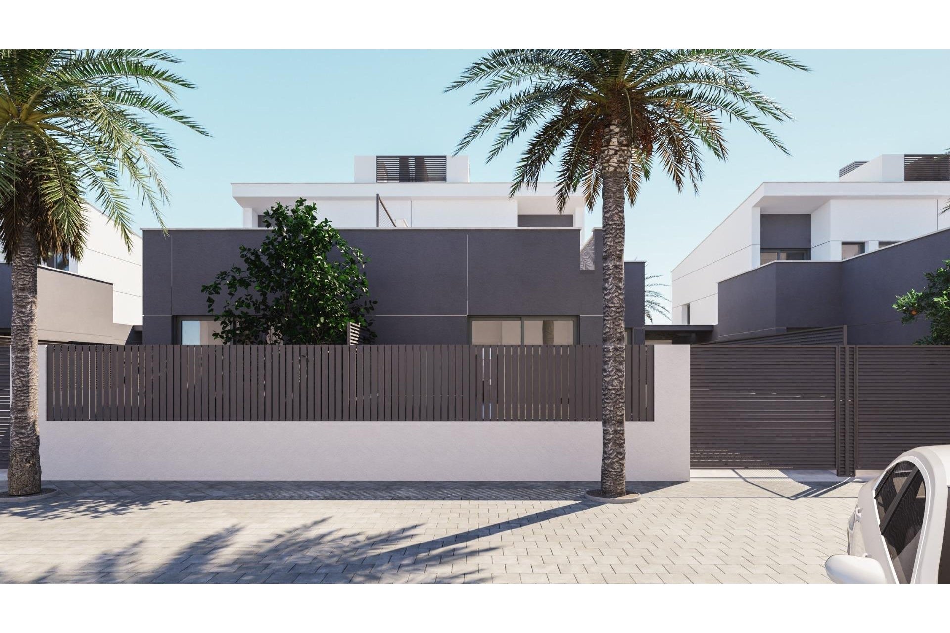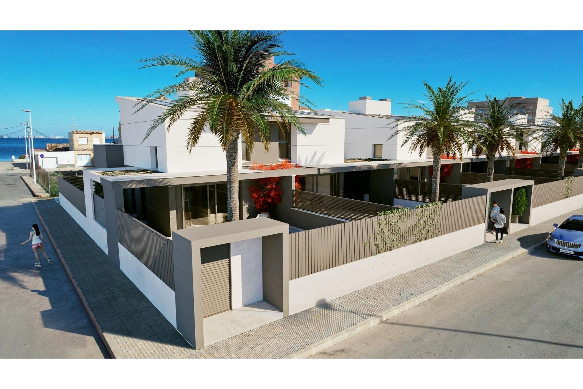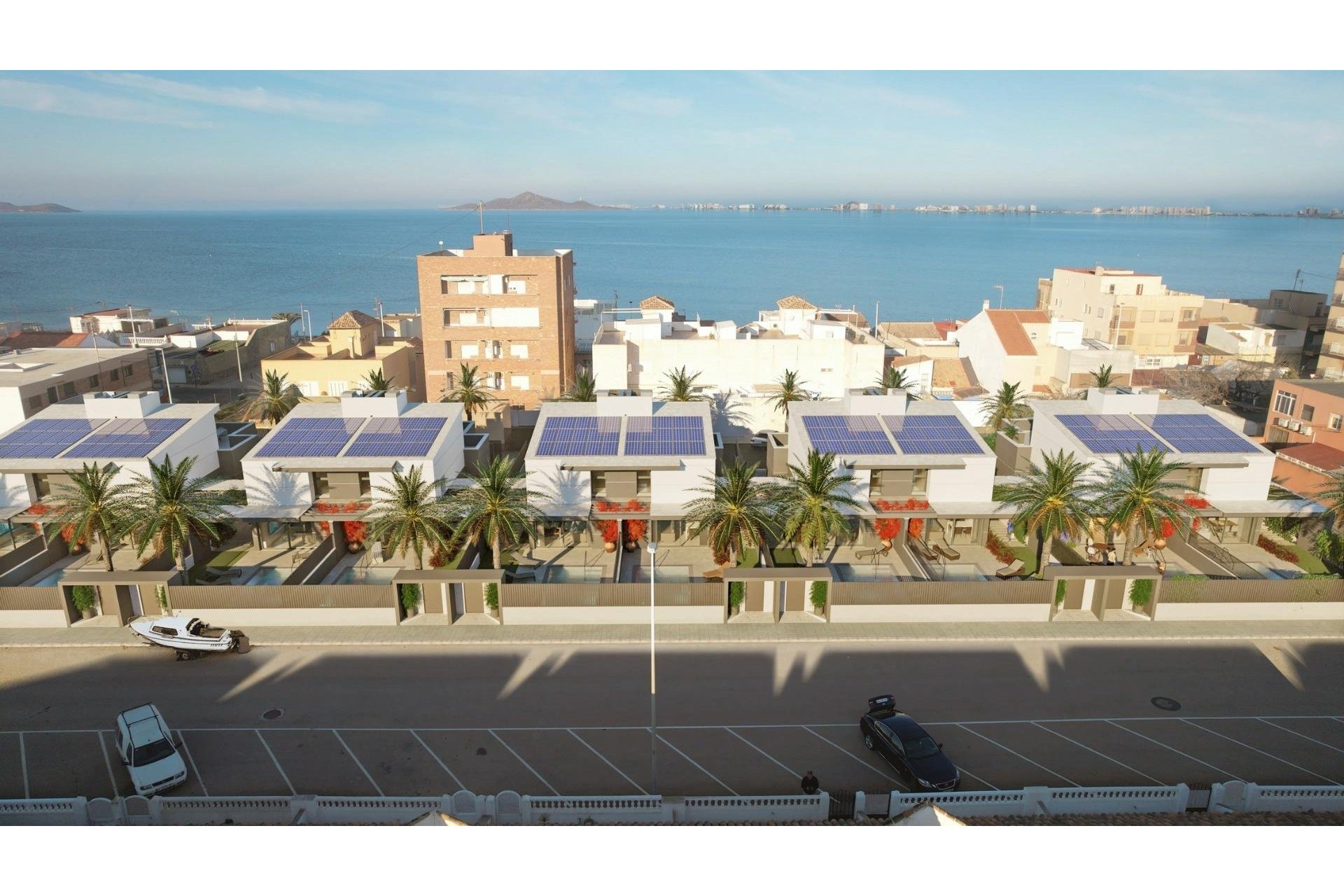 Zewnętrzne elementy są nie mniej imponujące, w tym prywatny basen i duże solarium z letnią kuchnią, dzięki czemu można cieszyć się słońcem przez cały rok. Ponadto domy mają zainstalowane panele słoneczne.