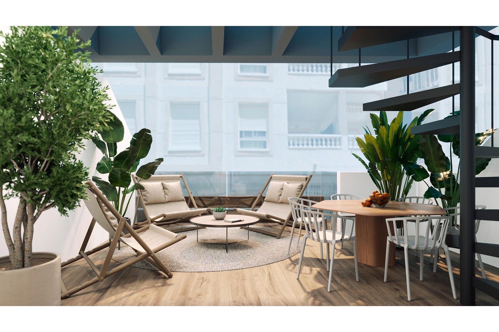 Solarium na dachu z miejscami do odpoczynku i bujną roślinnością