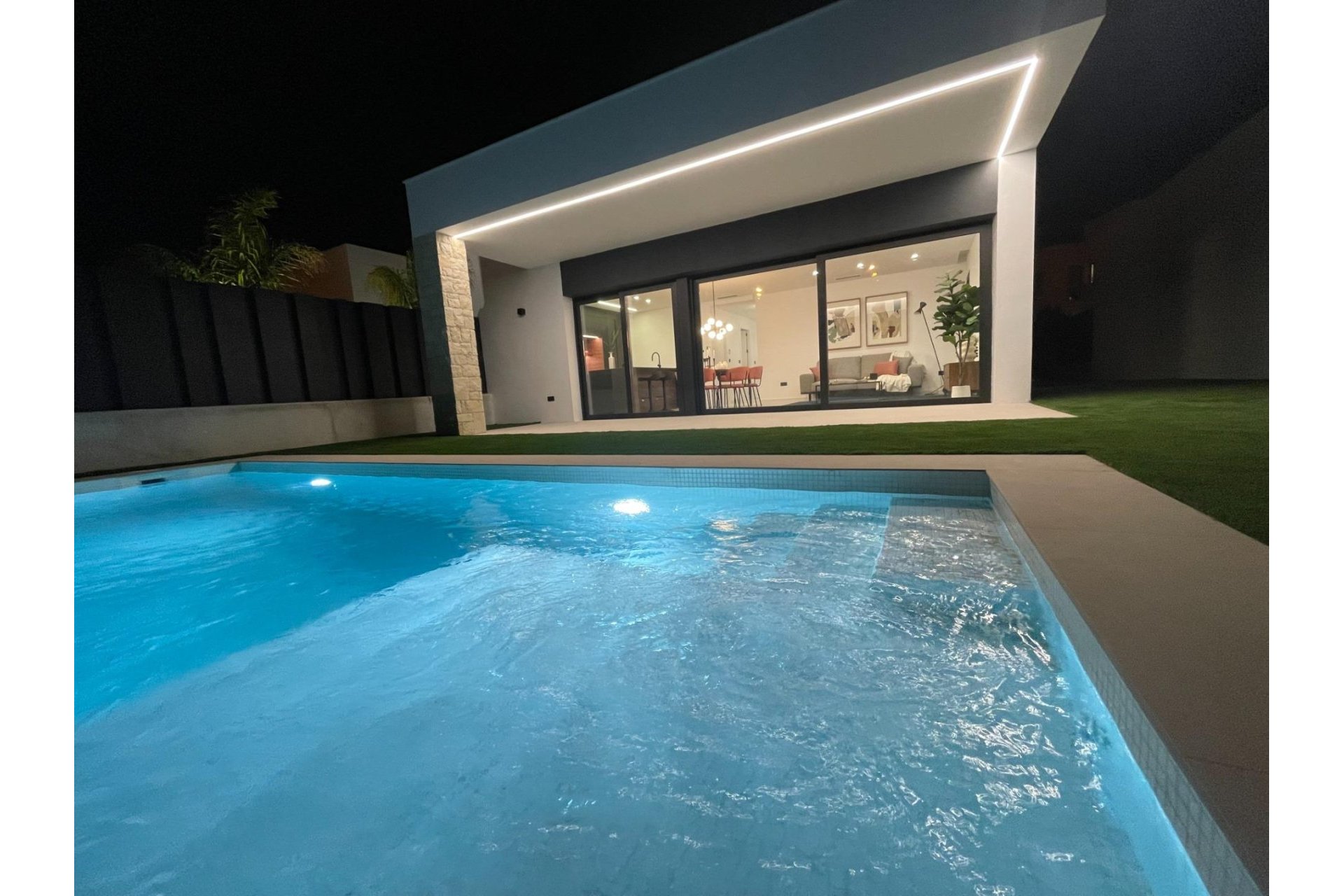 Rynek Pierwotny jednopoziomowa willa z 3 sypialniami, 2 łazienkami, kuchnią na otwartym planie z przestronnym salonem, wbudowanymi szafami, tarasem, prywatnym ogrodem z basenem i miejscem parkingowym.