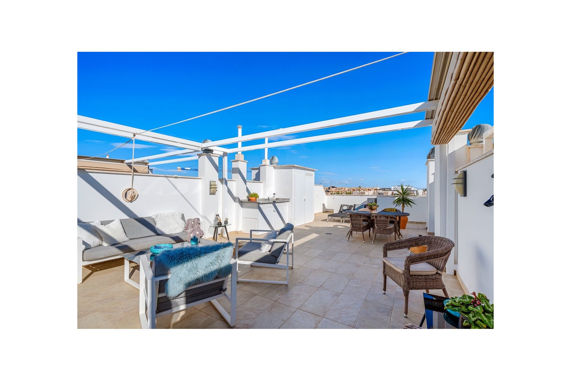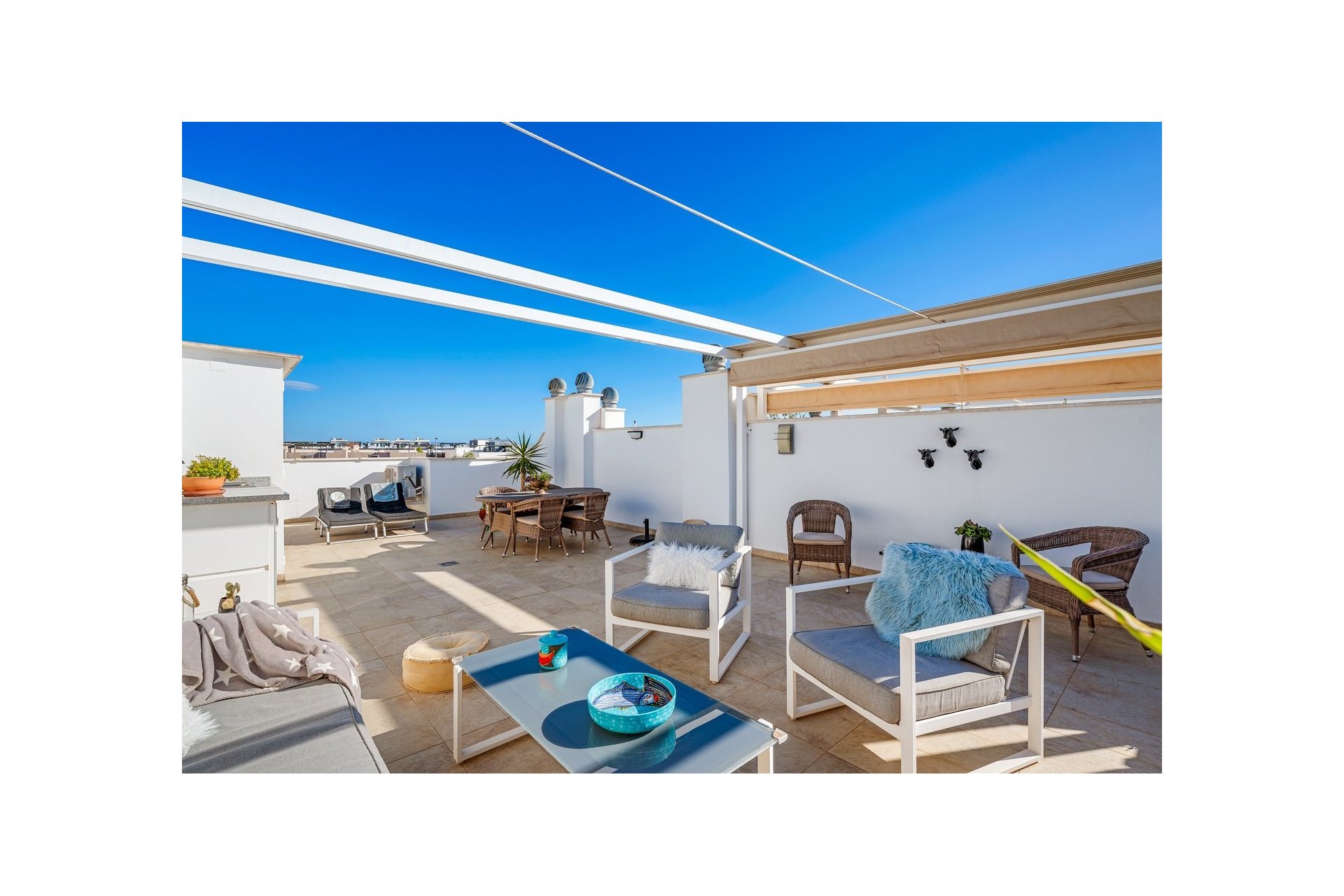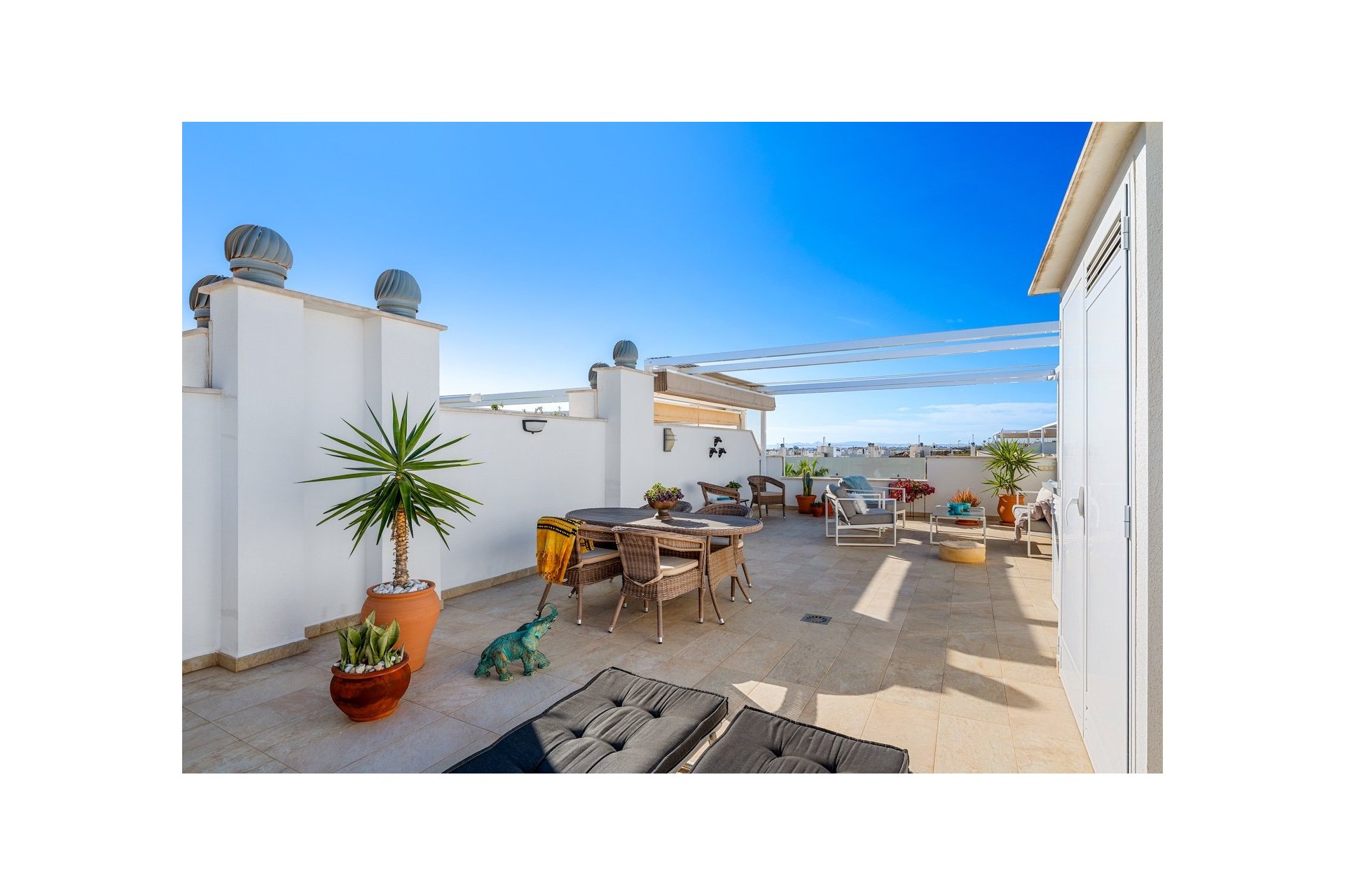 Mieszkanie posiada również duży taras na dachu z miejscem na kilka stref wypoczynkowych. Część tarasu jest zadaszona wysuwanym daszkiem. Znajduje się tam również pomieszczenie gospodarcze.