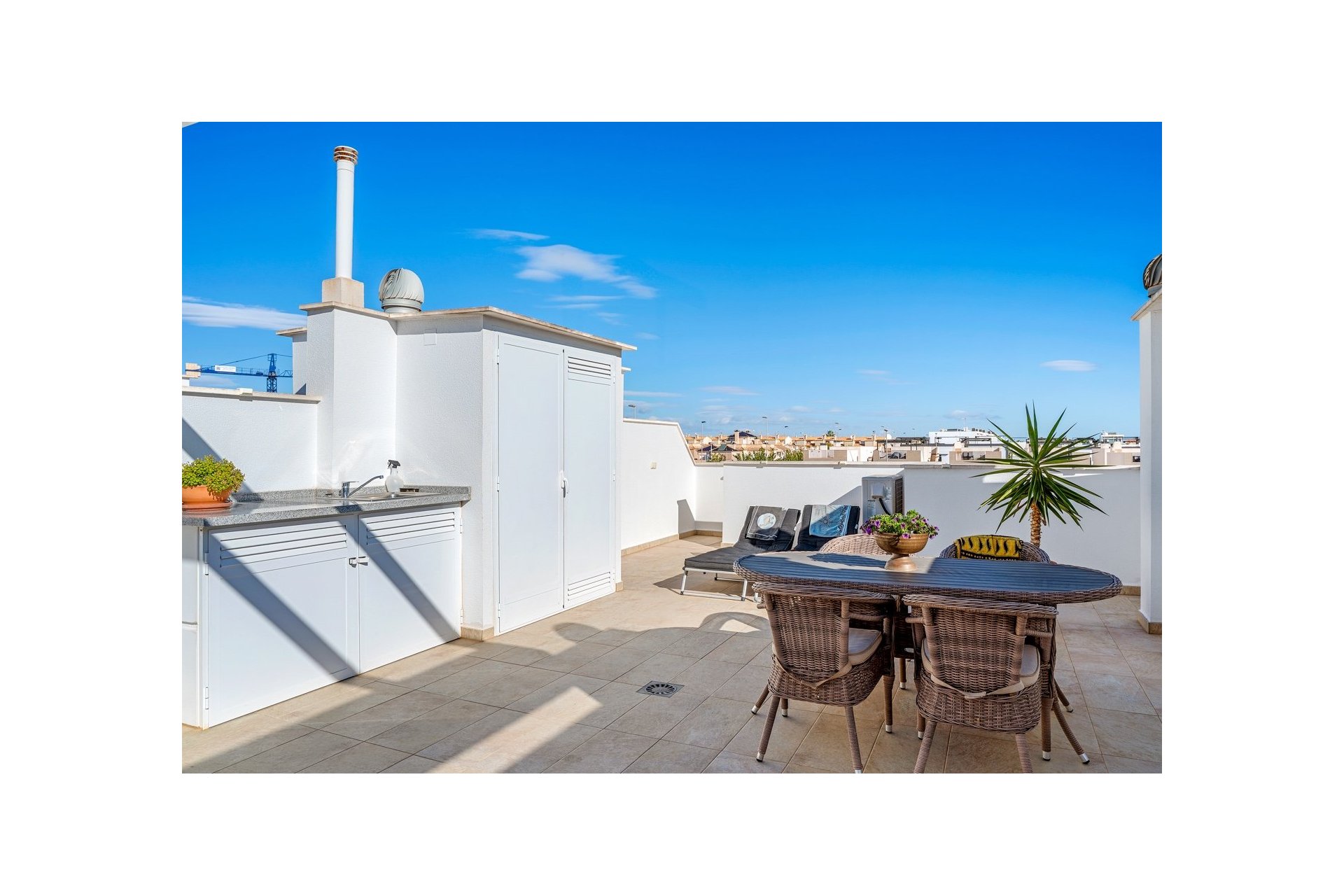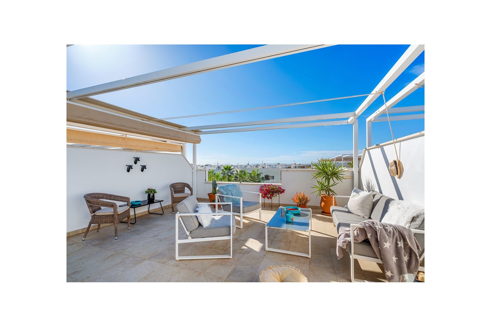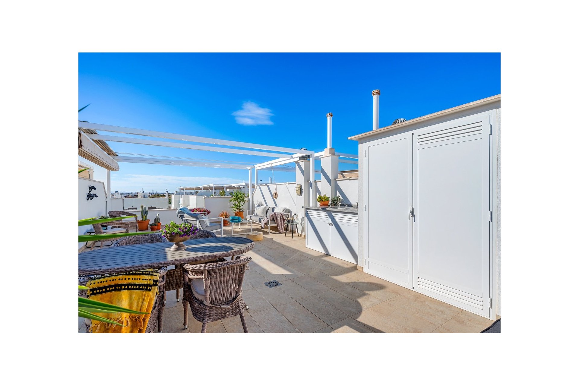 Mieszkanie posiada również duży taras na dachu z miejscem na kilka stref wypoczynkowych. Część tarasu jest zadaszona wysuwanym daszkiem. Znajduje się tam również pomieszczenie gospodarcze.