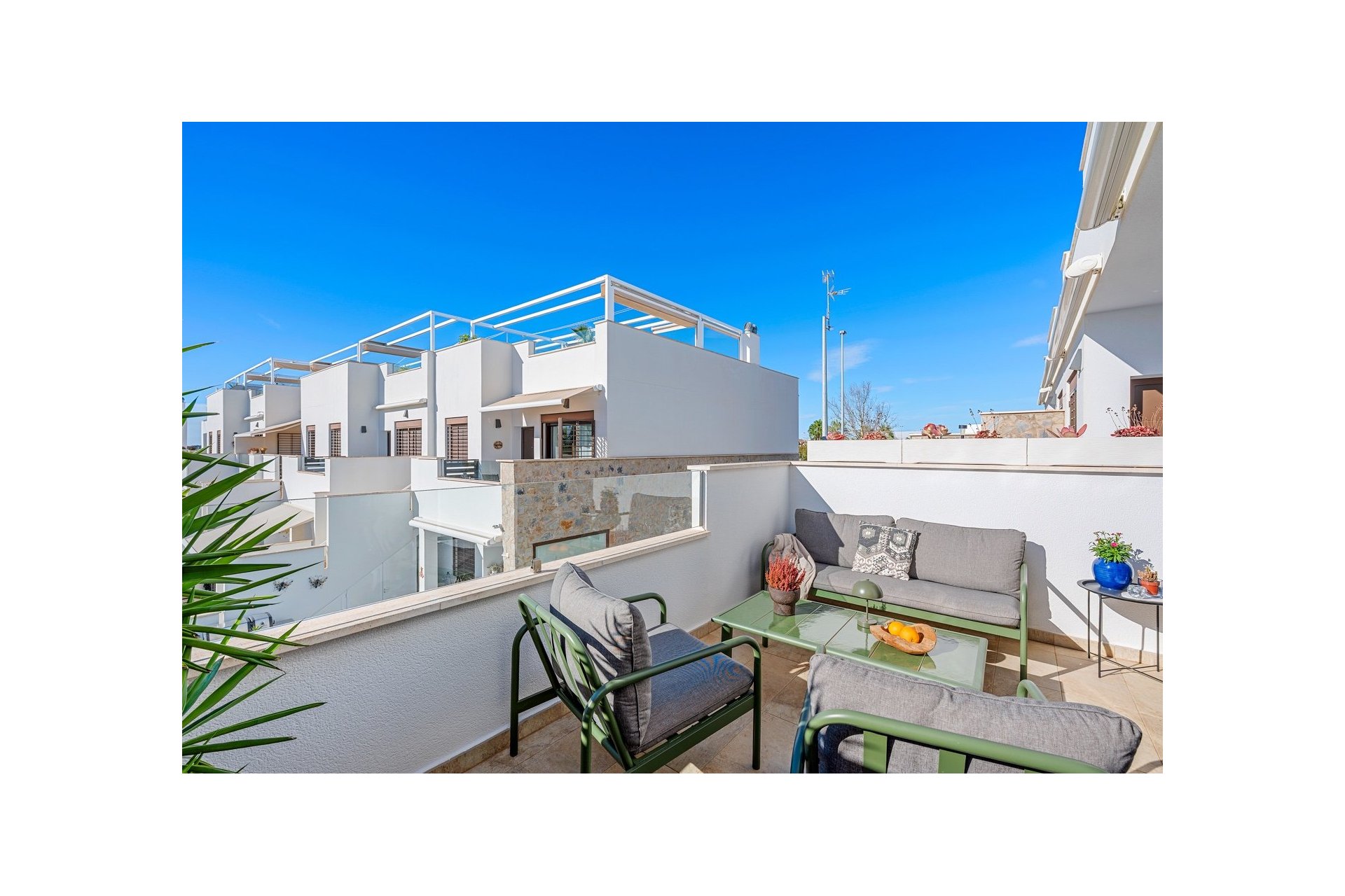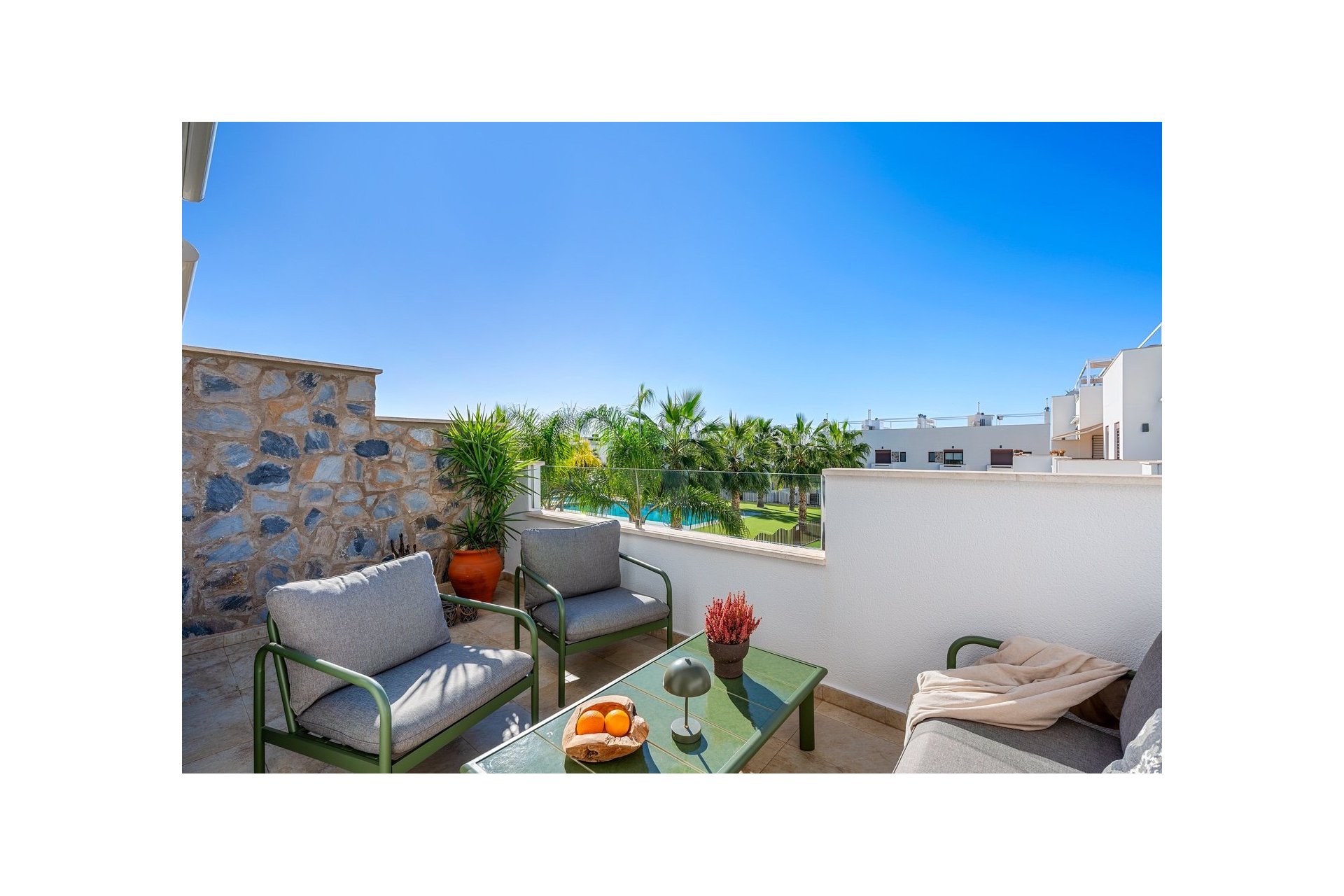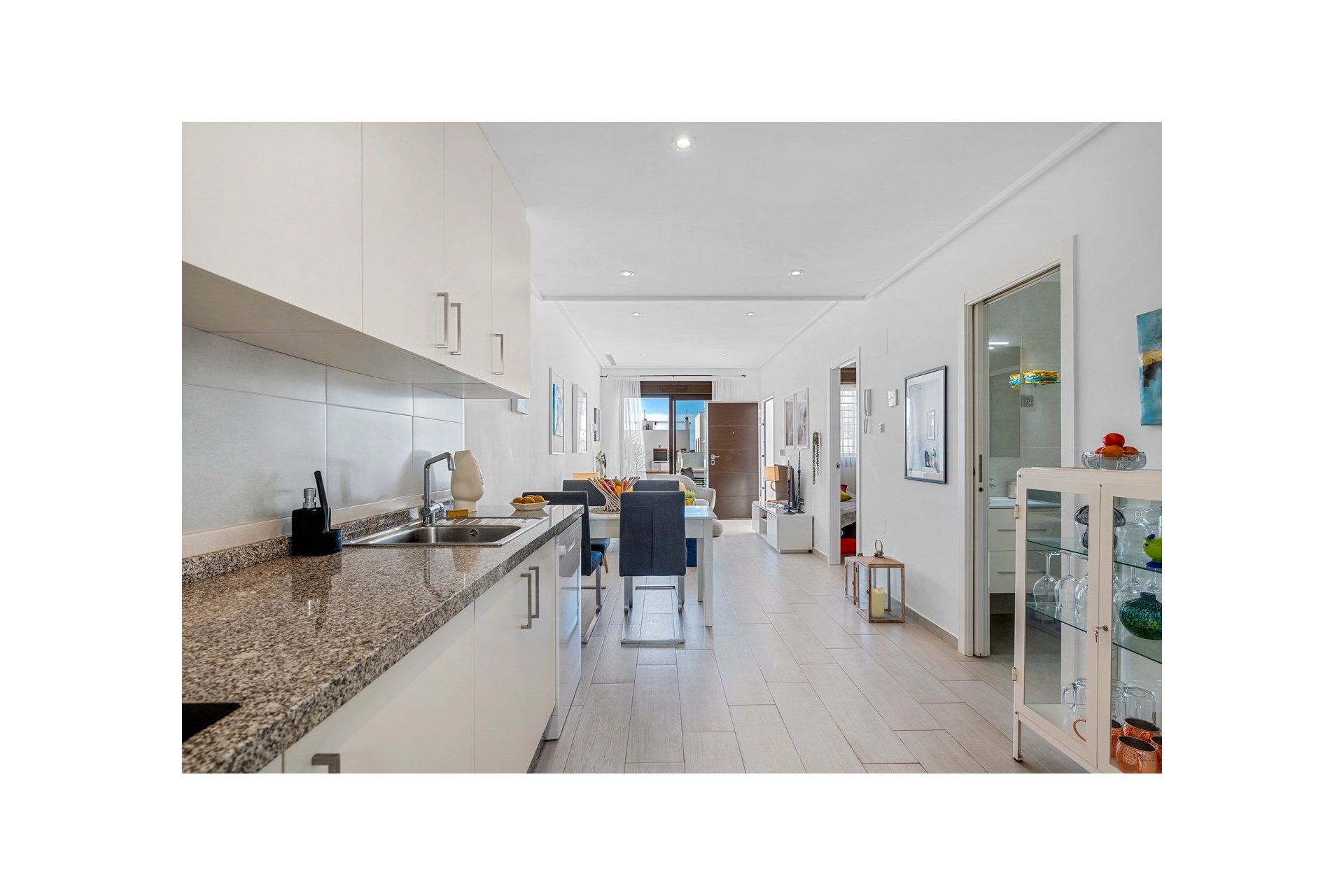 Mieszkanie ma powierzchnię 67 m², w której znajdują się dwie podwójne sypialnie i dwie nowoczesne łazienki; jedna z nich przynależy do sypialni głównej. Jest także jasna kuchnia w układzie otwartym połączona z jadalnią i salonem. Z kuchni jest bezpośrednie wyjście na taras na dachu, a z salonu – na piękny taras od strony południowej.