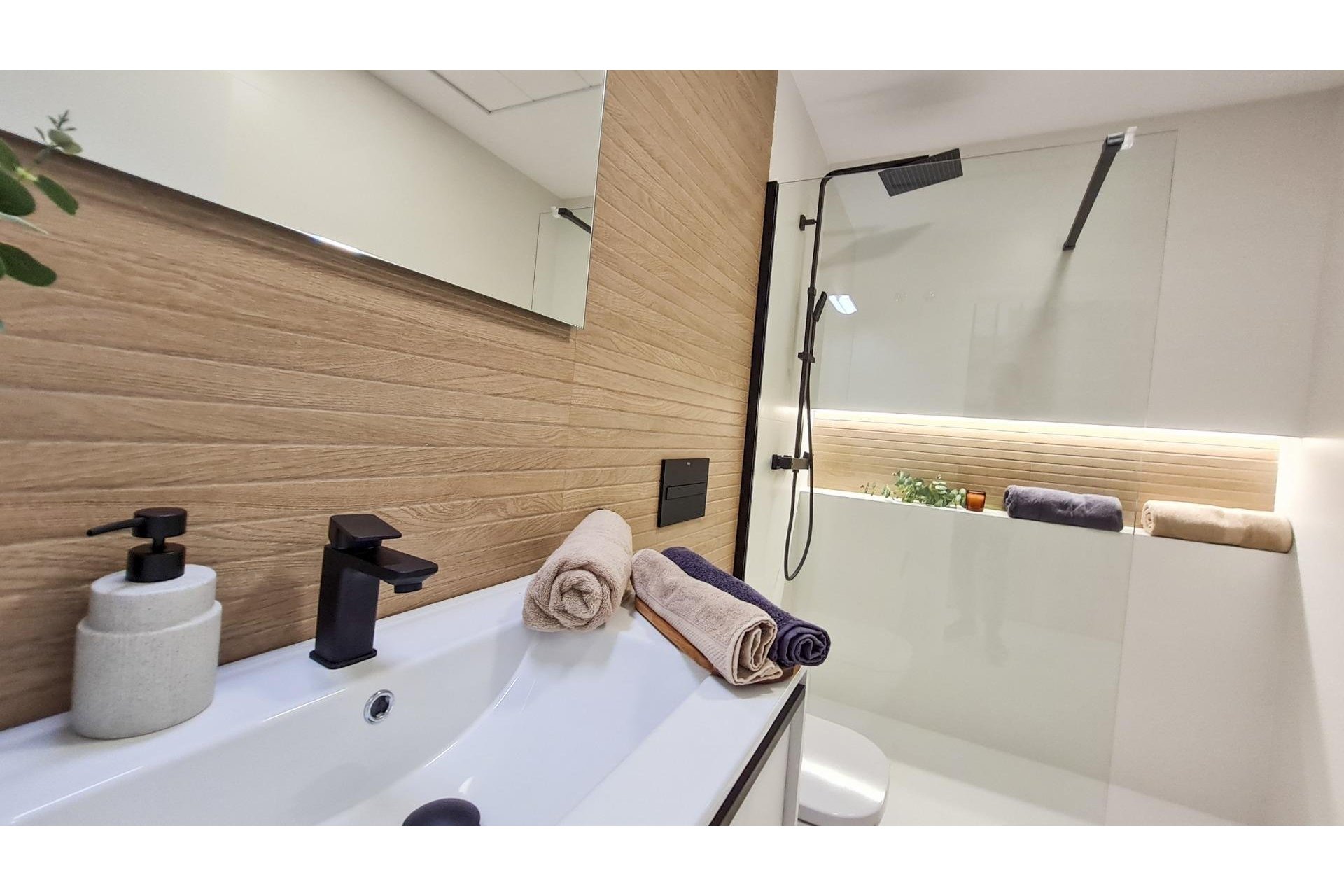 Kompletne łazienki z umywalką, wiszącą toaletą z wbudowaną spłuczką, lustrem, prysznicem ze strumieniem deszczowym i parawanami.