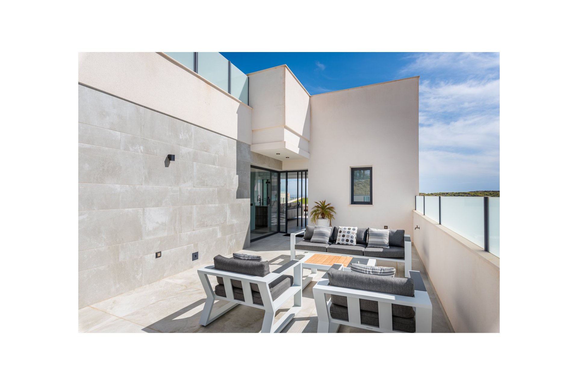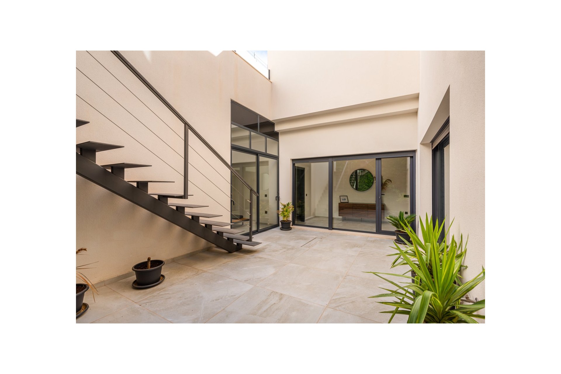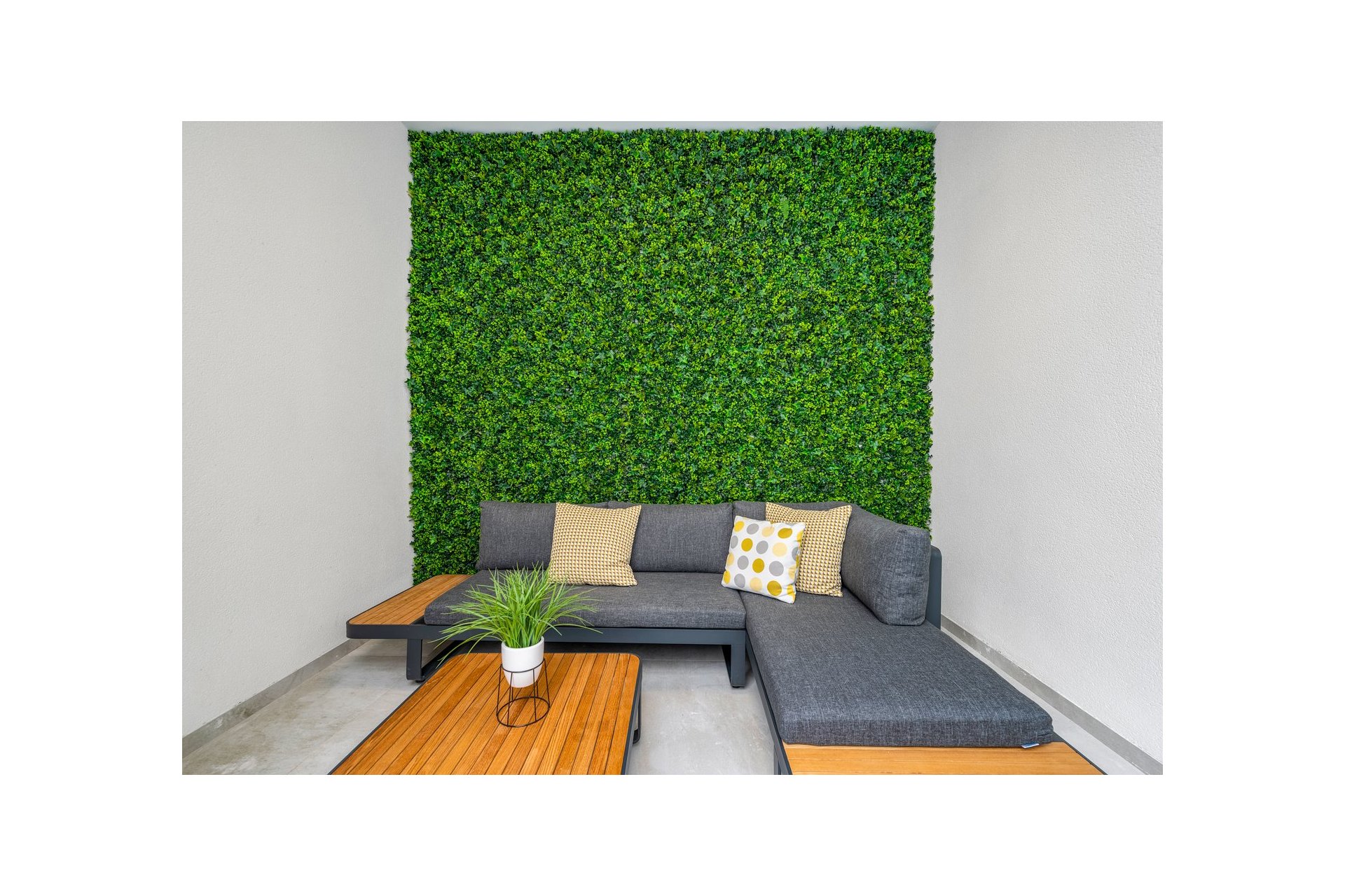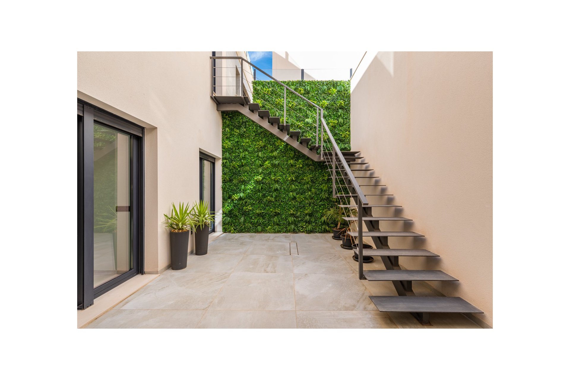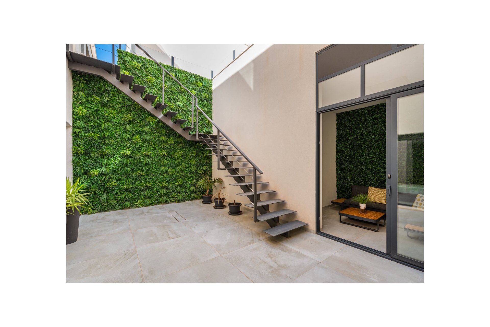 Na niższym poziomie znajduje się duże, wyłożone płytkami patio ze sztucznym wertykalnym ogrodem. Do tego patio można wejść z ogrodu po zewnętrznych schodach, a także z salonu i 2 sypialni na dolnym poziomie.