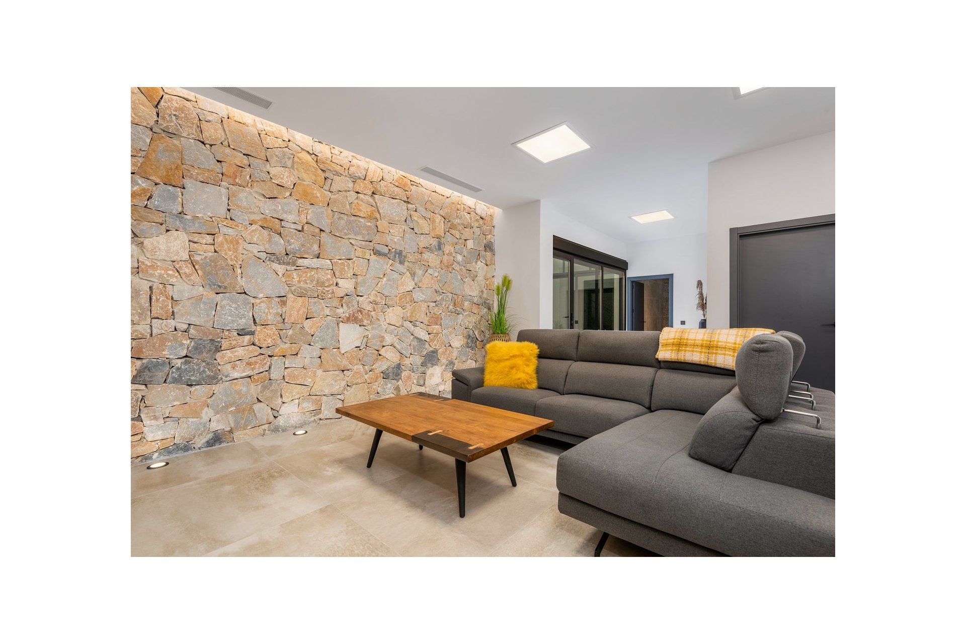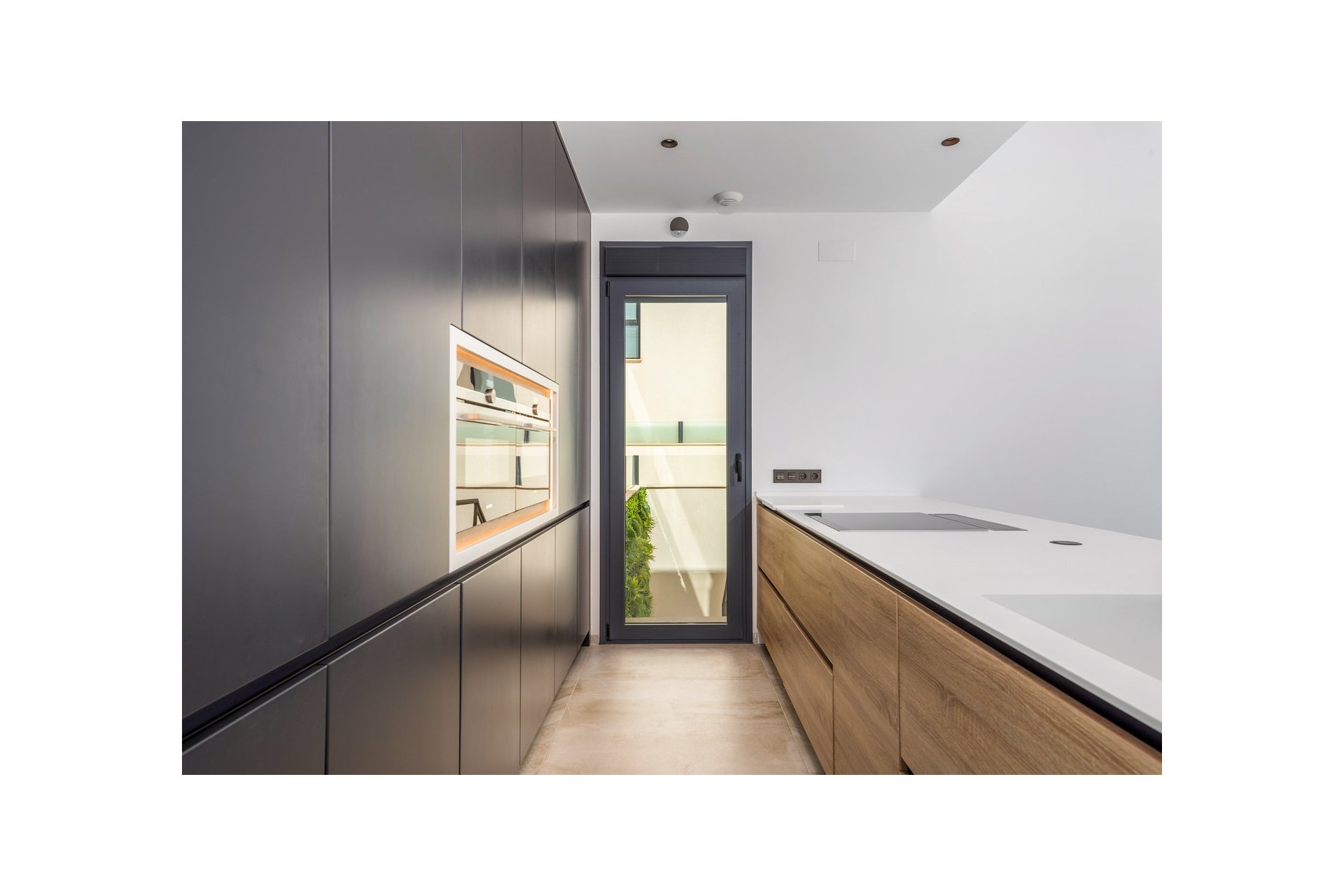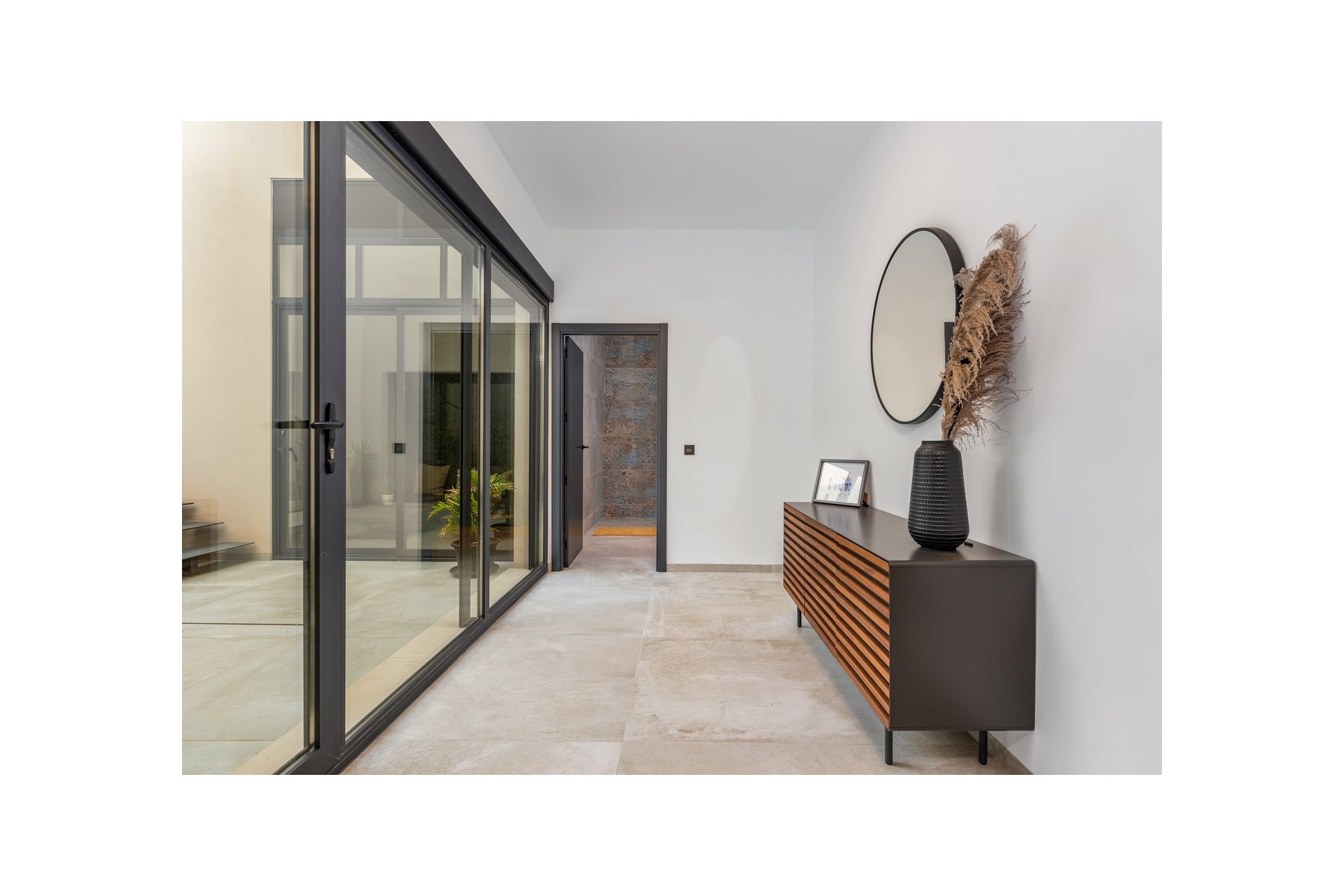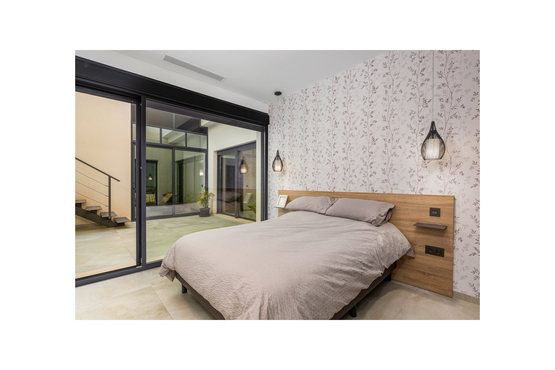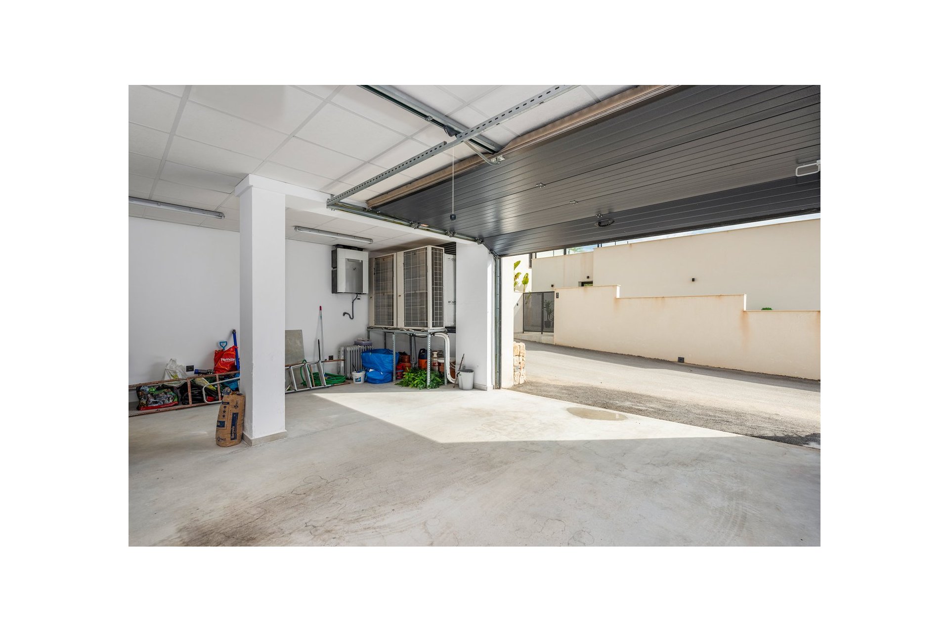 Na niższym poziomie znajduje się duże, wyłożone płytkami patio ze sztucznym wertykalnym ogrodem. Do tego patio można wejść z ogrodu po zewnętrznych schodach, a także z salonu i 2 sypialni na dolnym poziomie.