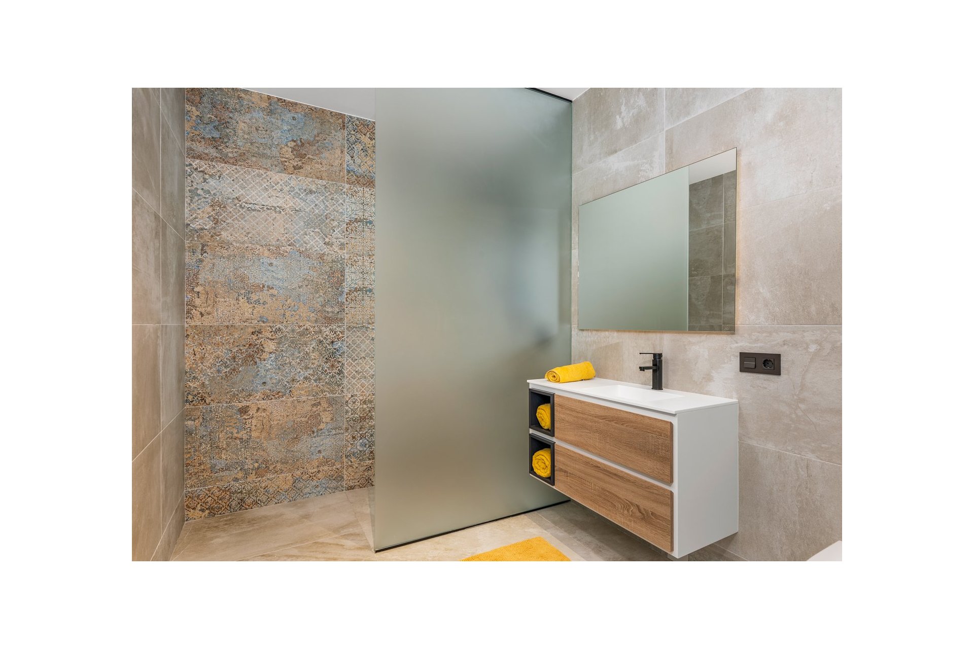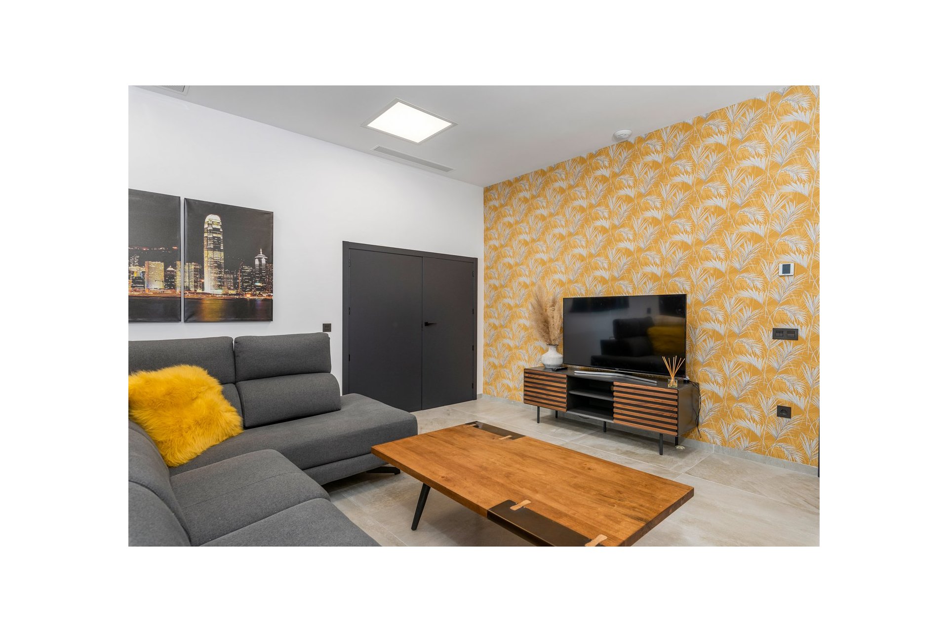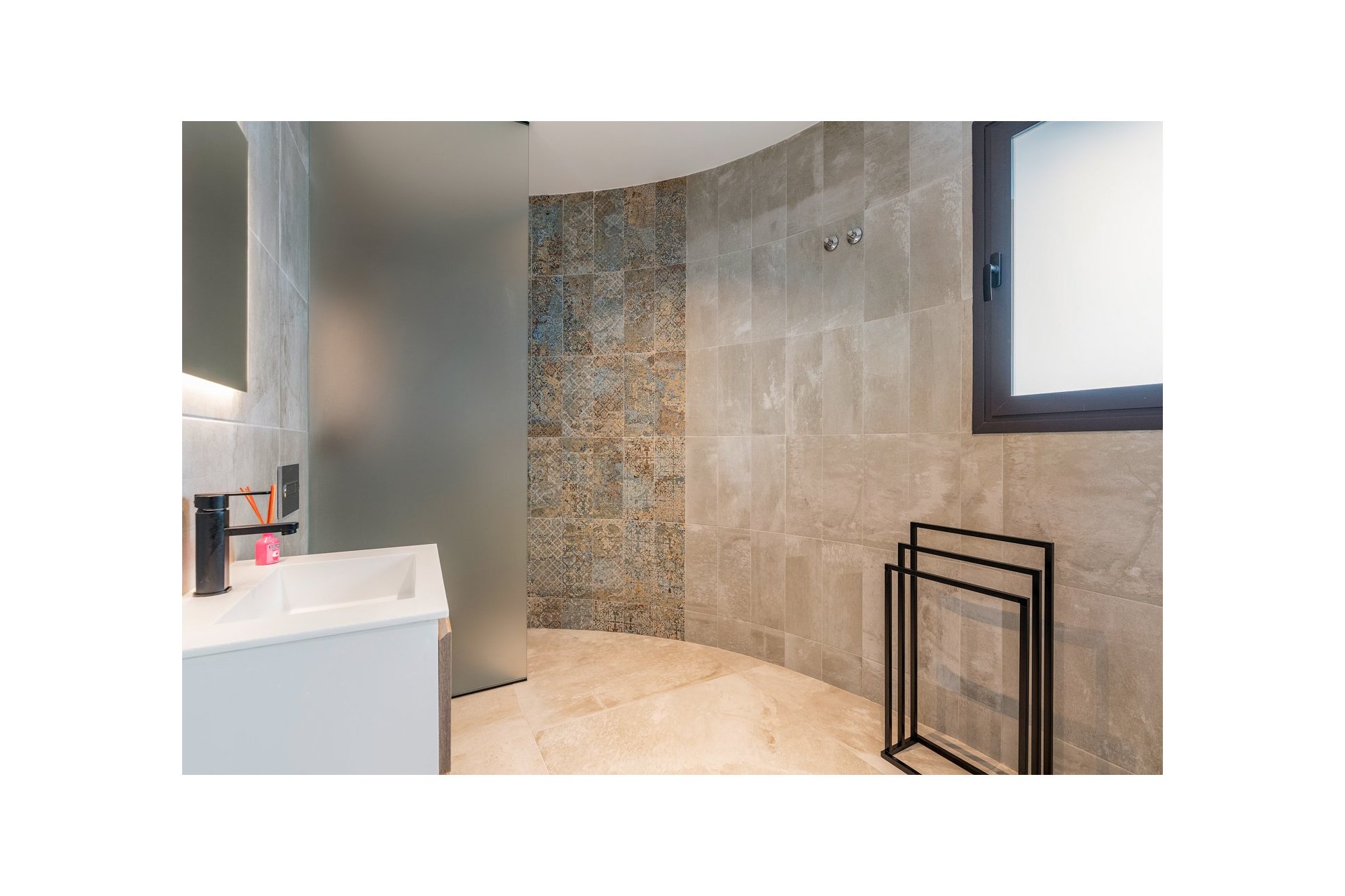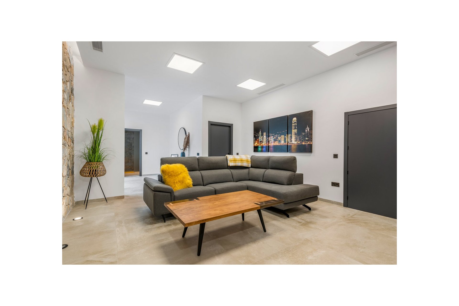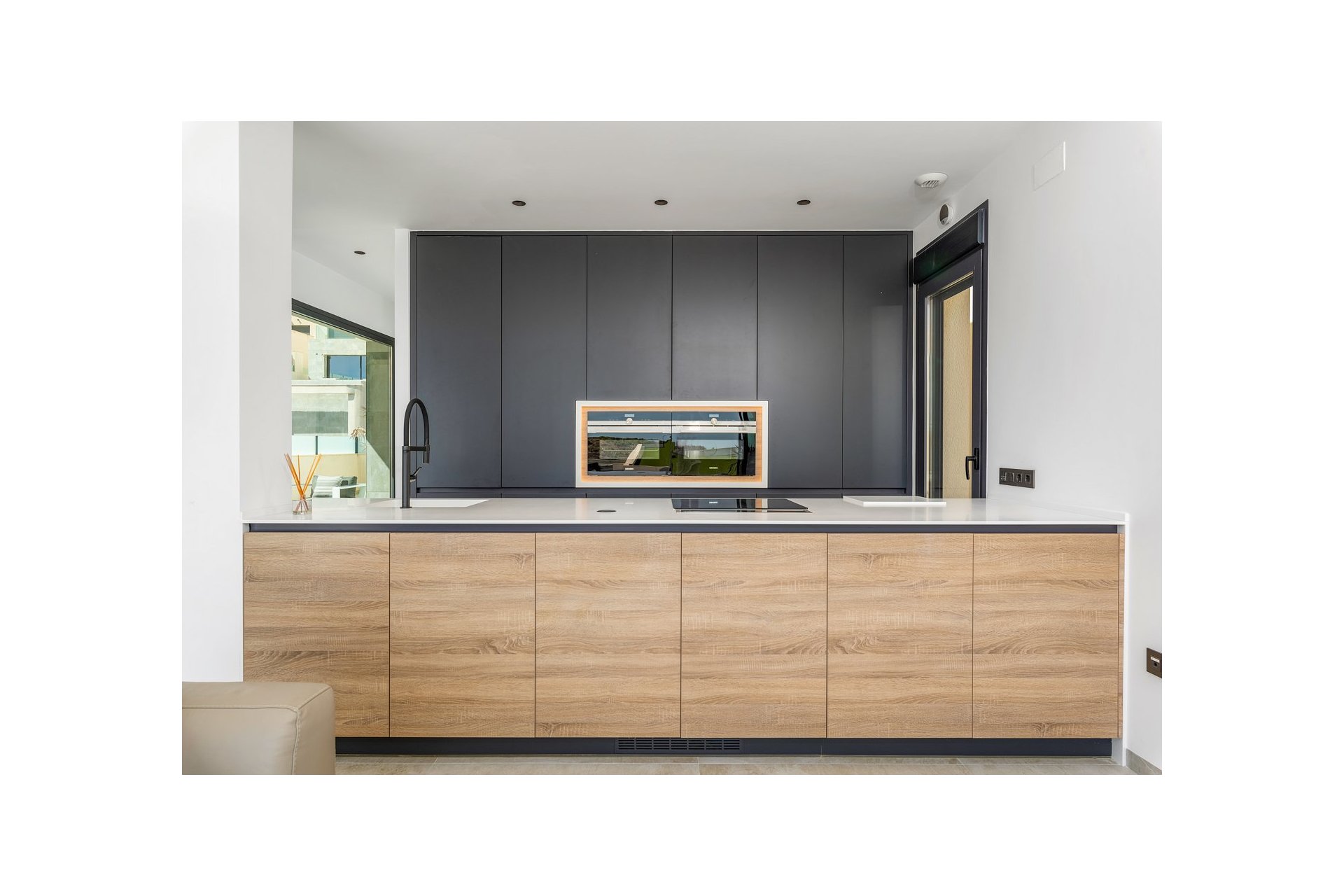 Na niższym poziomie znajduje się duże, wyłożone płytkami patio ze sztucznym wertykalnym ogrodem. Do tego patio można wejść z ogrodu po zewnętrznych schodach, a także z salonu i 2 sypialni na dolnym poziomie.