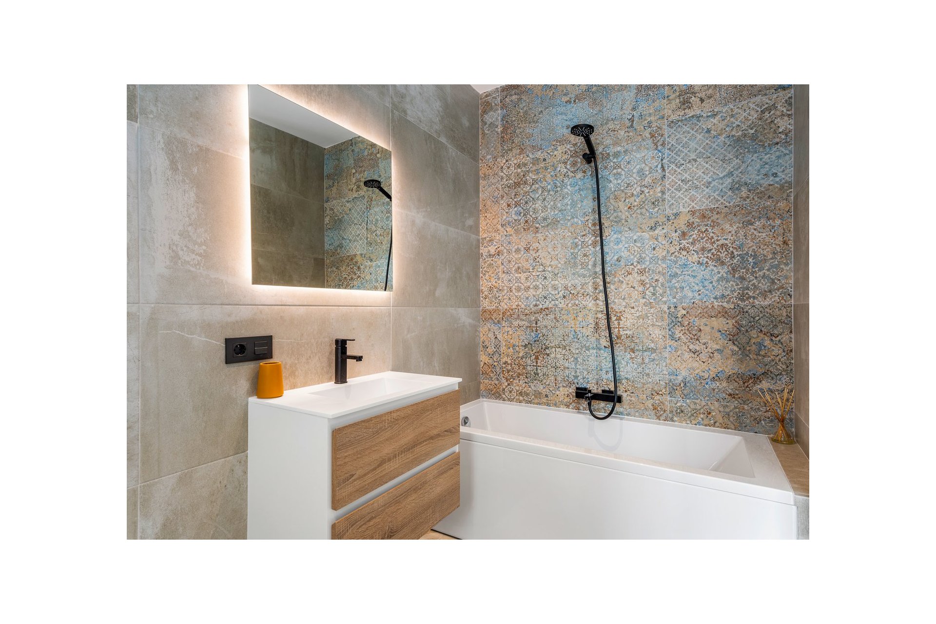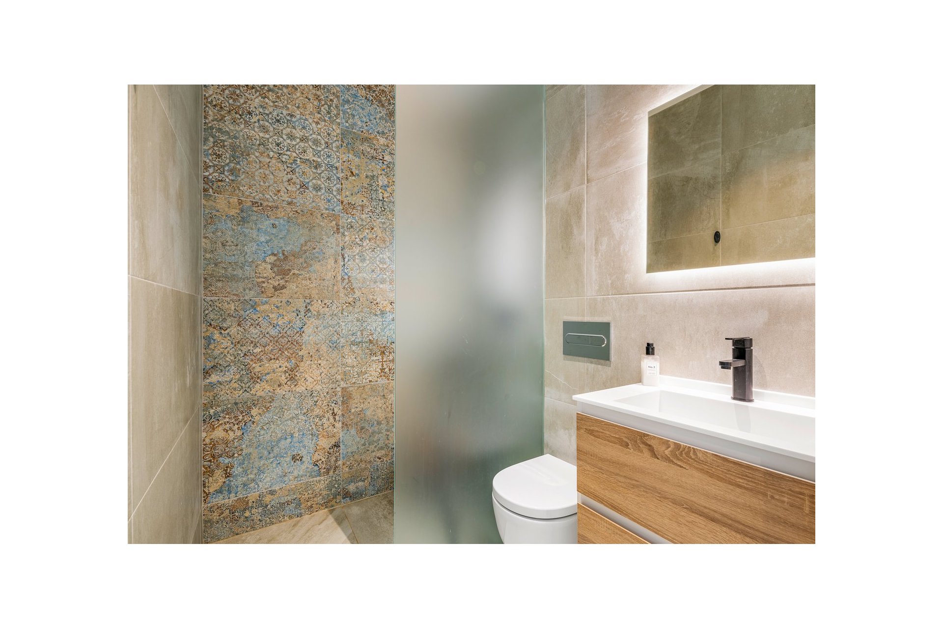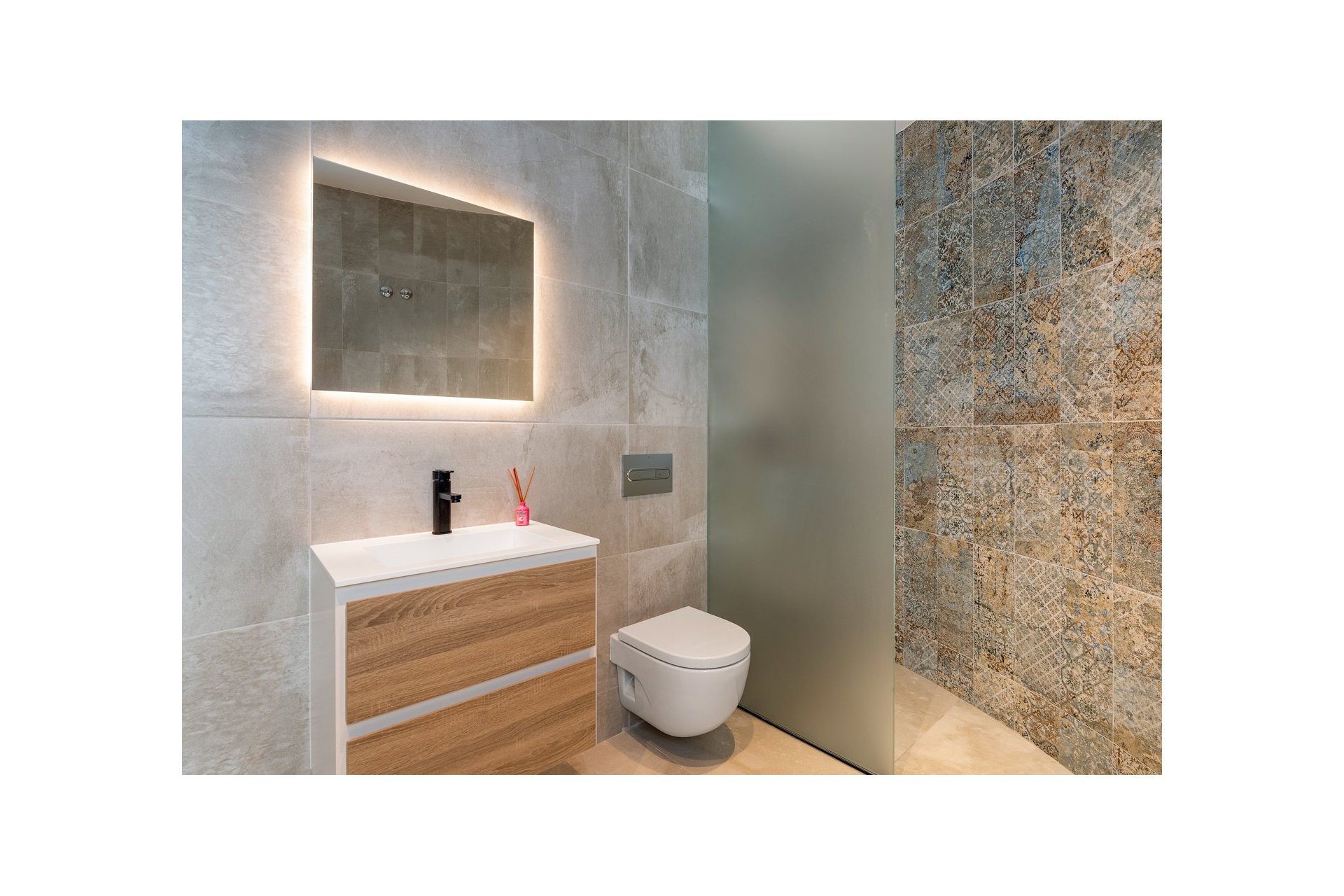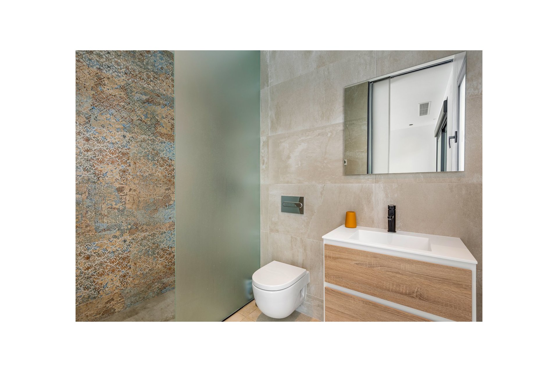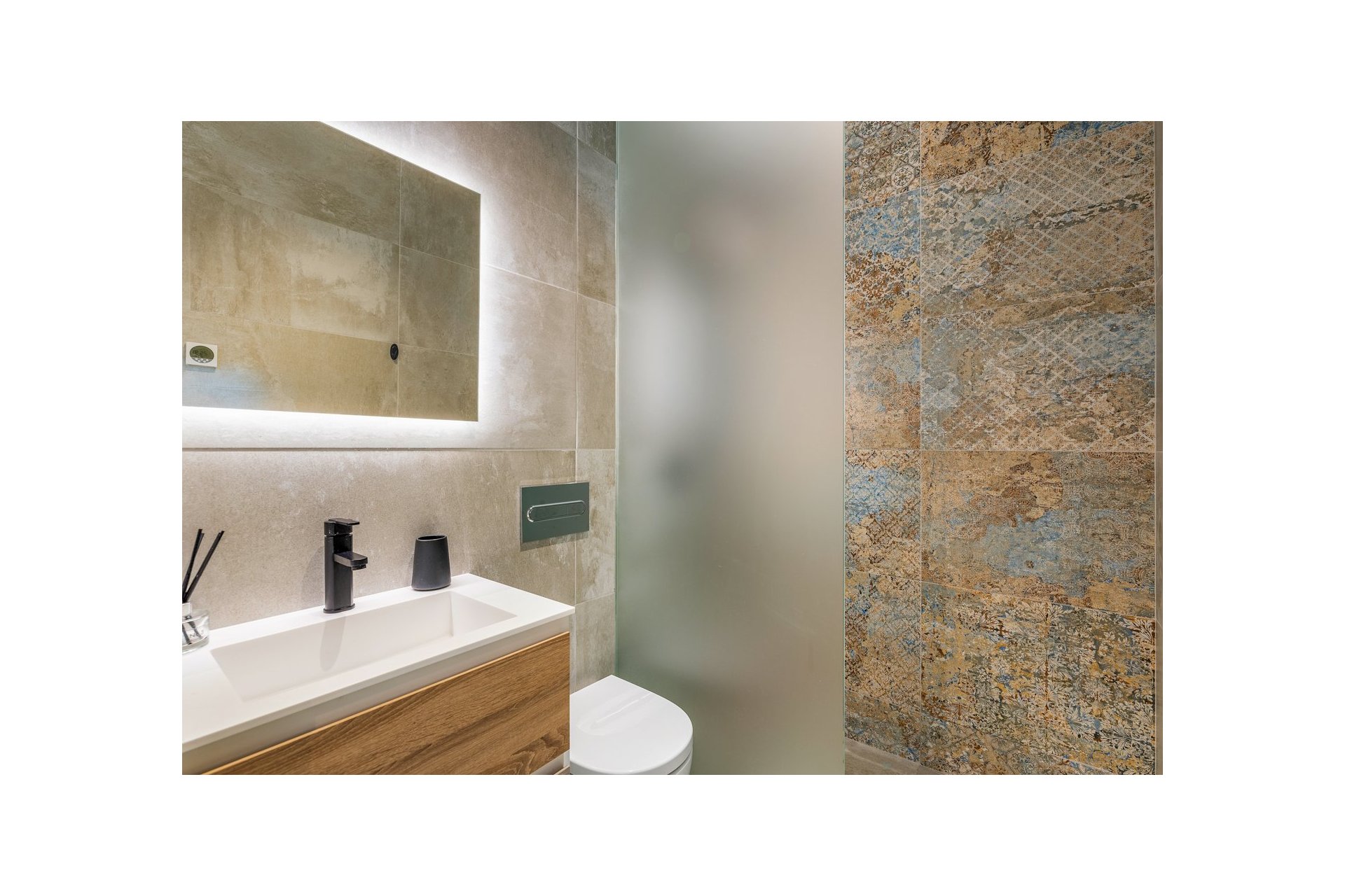 Na niższym poziomie znajduje się duże, wyłożone płytkami patio ze sztucznym wertykalnym ogrodem. Do tego patio można wejść z ogrodu po zewnętrznych schodach, a także z salonu i 2 sypialni na dolnym poziomie.