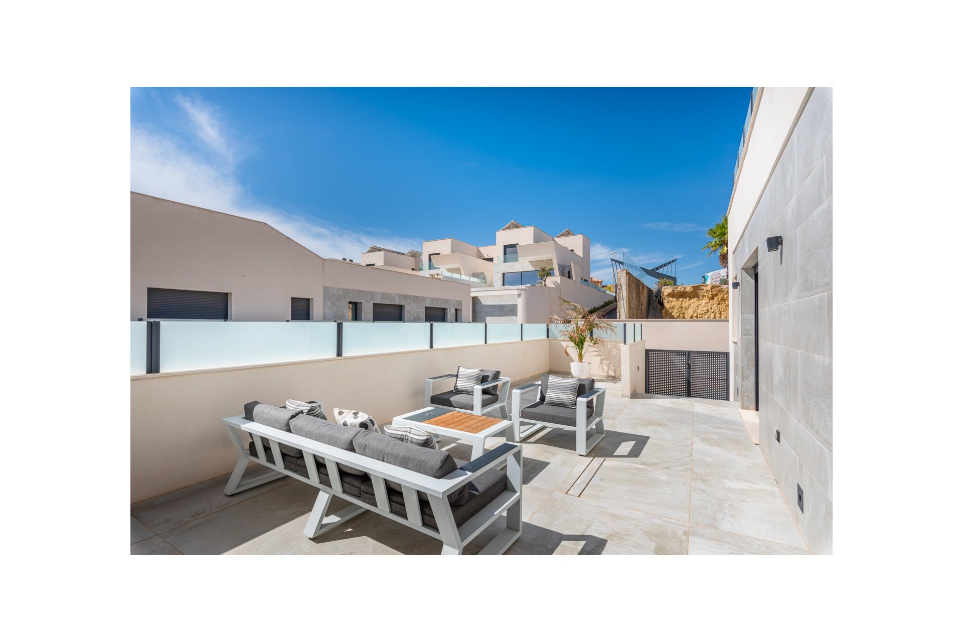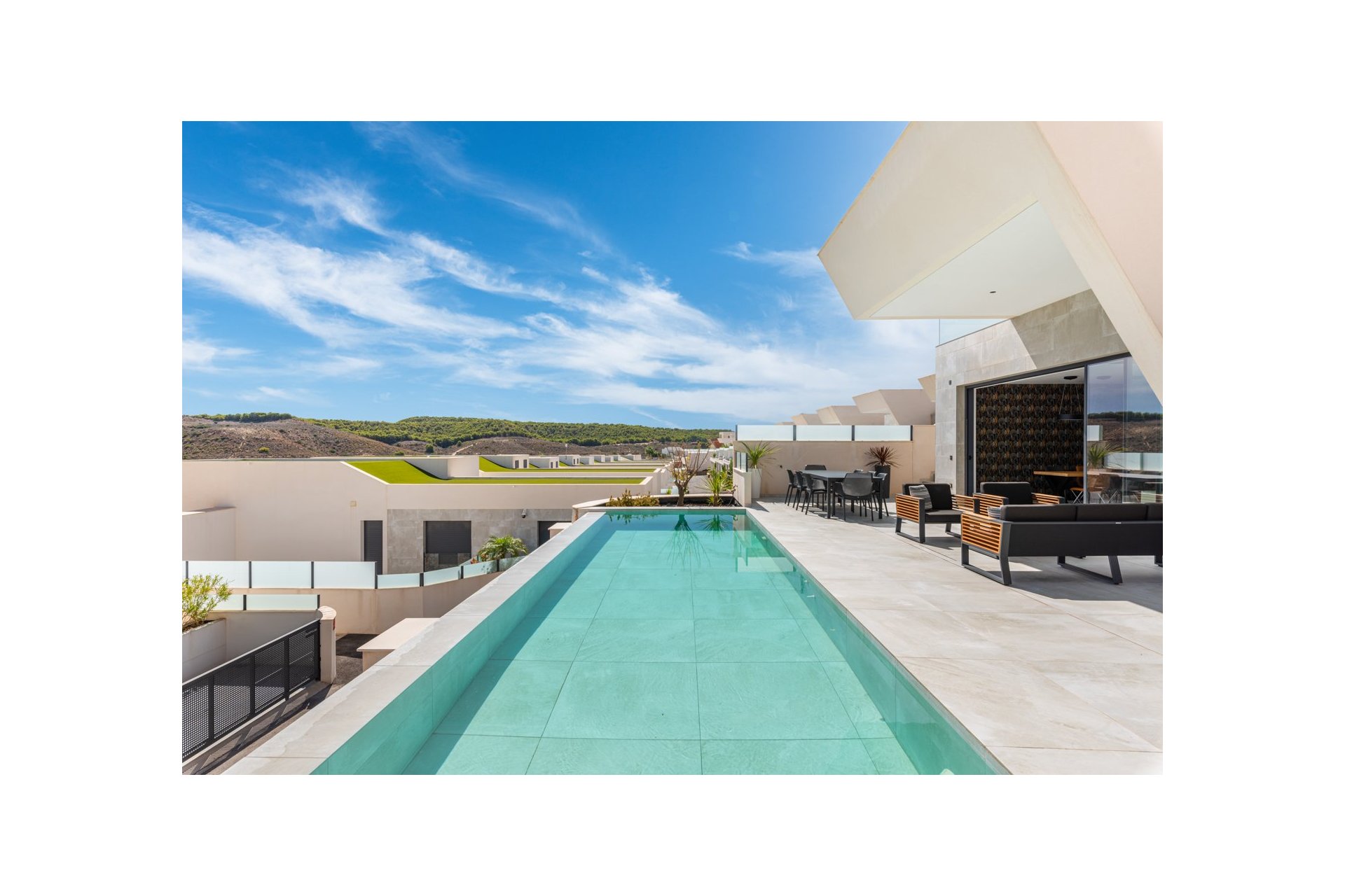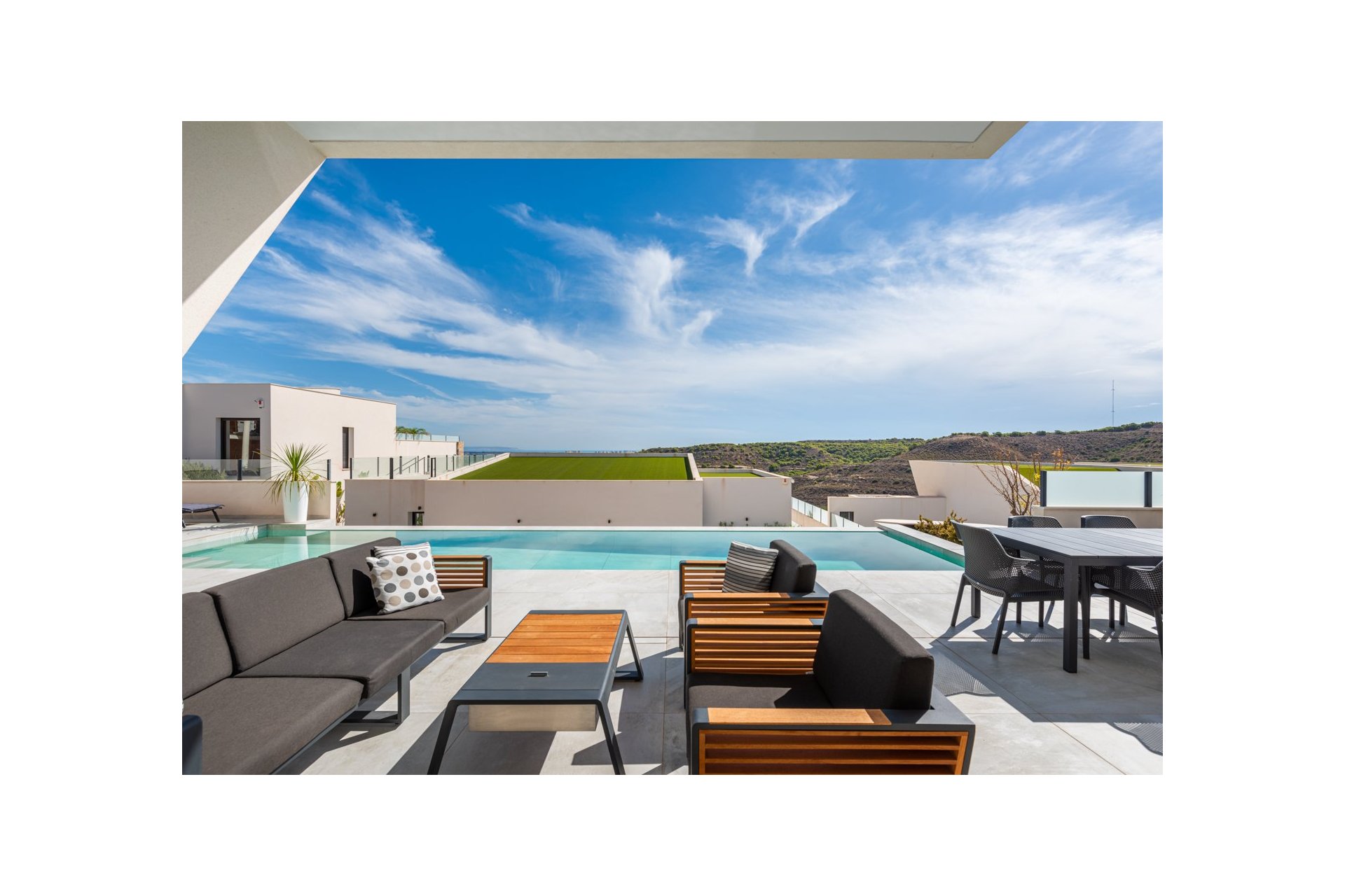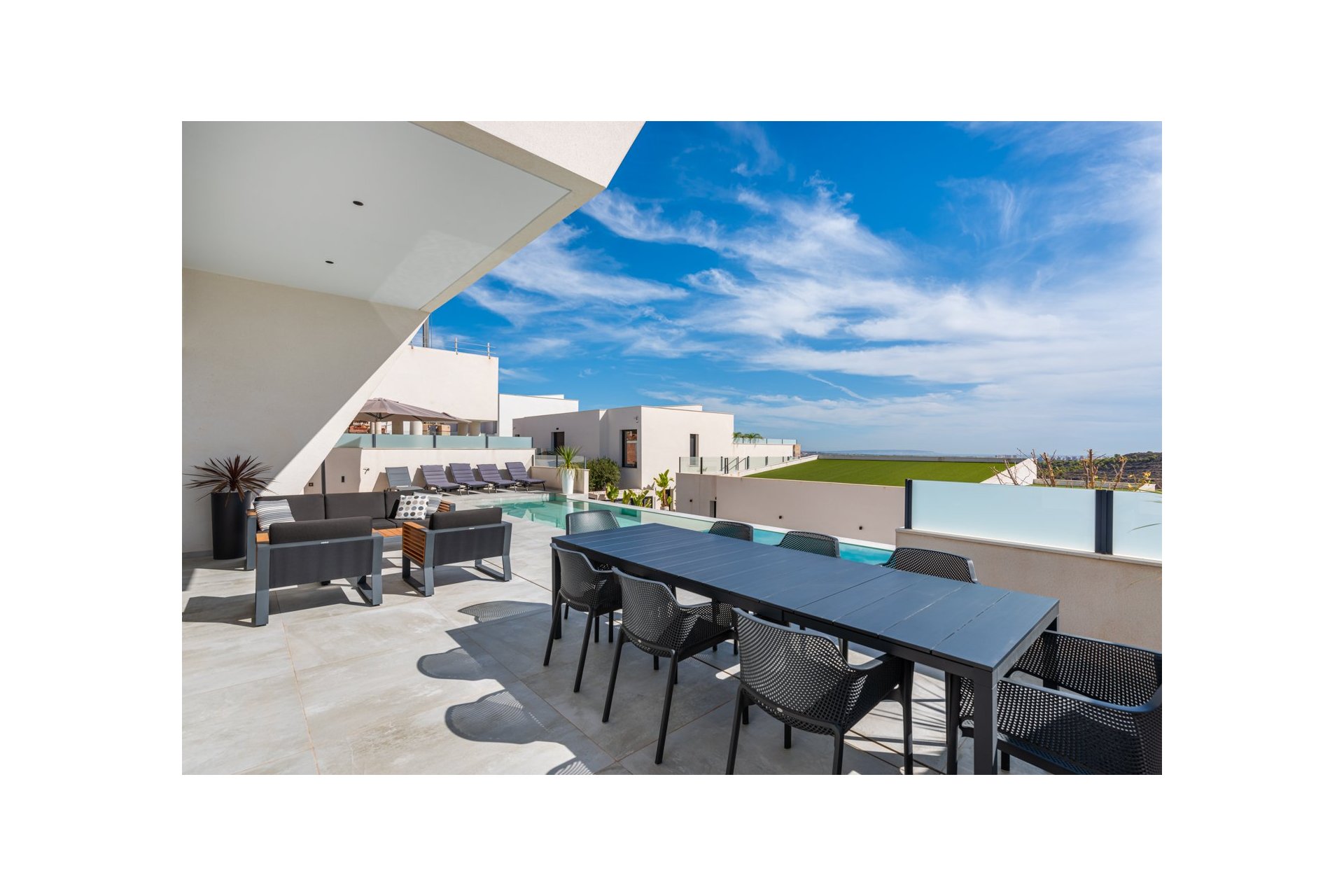 Willa położona jest na uroczej narożnej działce o powierzchni 462 m2. Basen jest skierowany na wschód, co zapewnia niesamowite widoki na okolicę i morze. Wokół basenu znajduje się piękny, wyłożony kafelkami obszar z miejscem na kilka miejsc do siedzenia na świeżym powietrzu i leżaki. Z basenu masz zewnętrzne schody prowadzące na duży taras na dachu. Tutaj masz jedną część wyłożoną kafelkami, a drugą część ze sztuczną trawą, obie z dużą ilością miejsca na rozrywkę na świeżym powietrzu i niesamowitymi widokami.