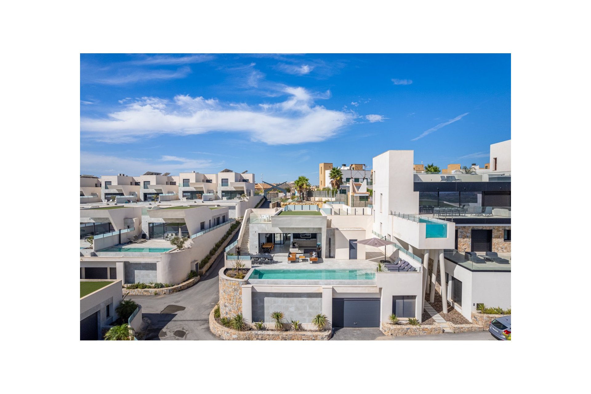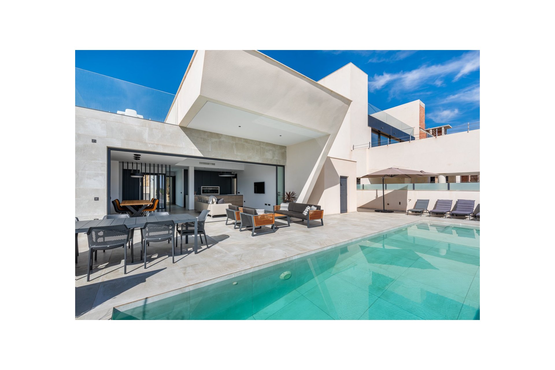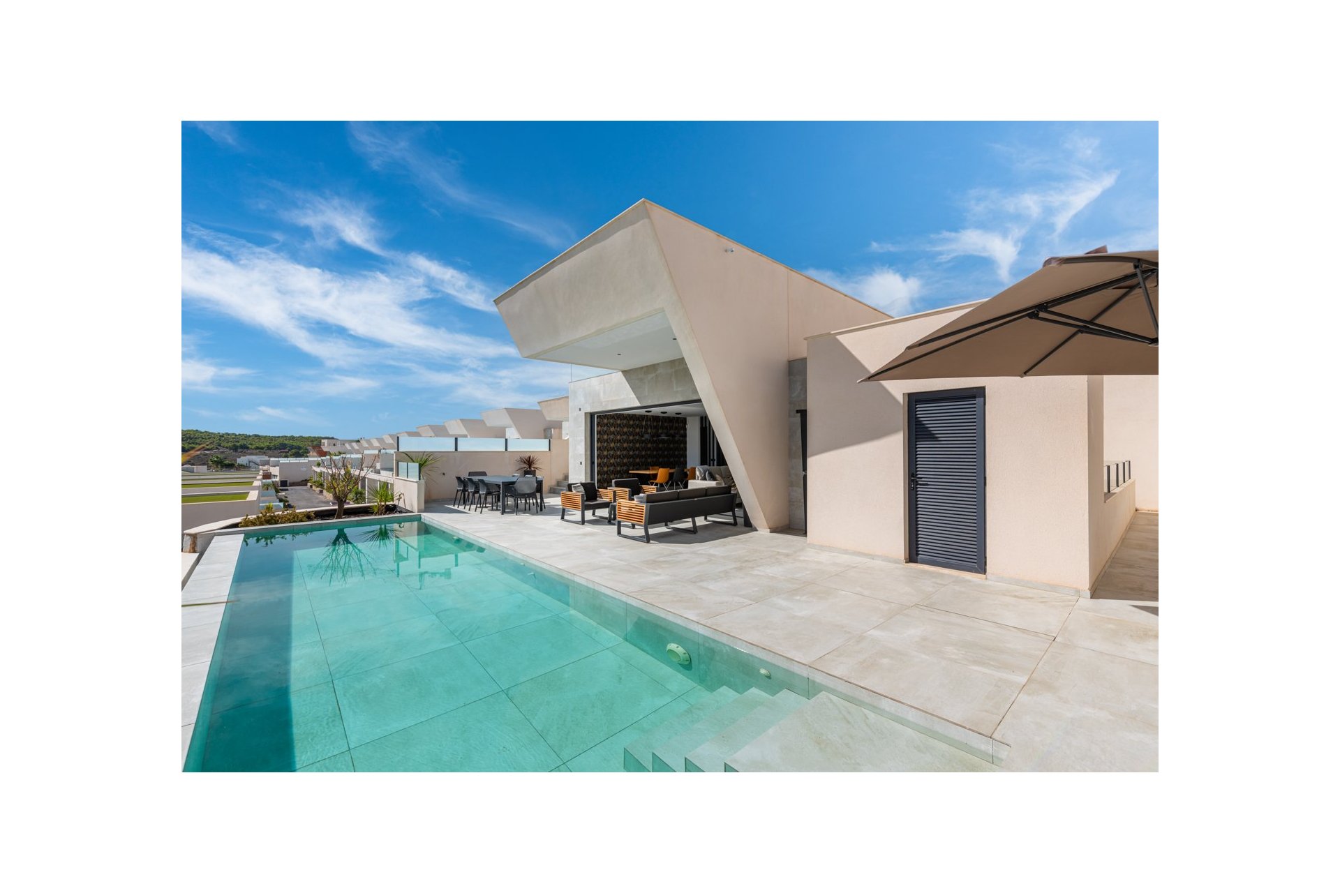 Piękna luksusowa willa o powierzchni mieszkalnej 333 m2 podzielona na dwa poziomy. Składa się w sumie z 5 sypialni dwuosobowych, wszystkie z łazienkami, dodatkowej łazienki i toalety dla gości. Na parterze znajdują się dwie sypialnie z łazienkami, toaleta dla gości oraz urocza otwarta kuchnia, salon i jadalnia. W części dziennej znajdują się duże przesuwane drzwi, które otwierają się całkowicie i zapewniają doskonałą funkcję mieszkalną wewnątrz / na zewnątrz.