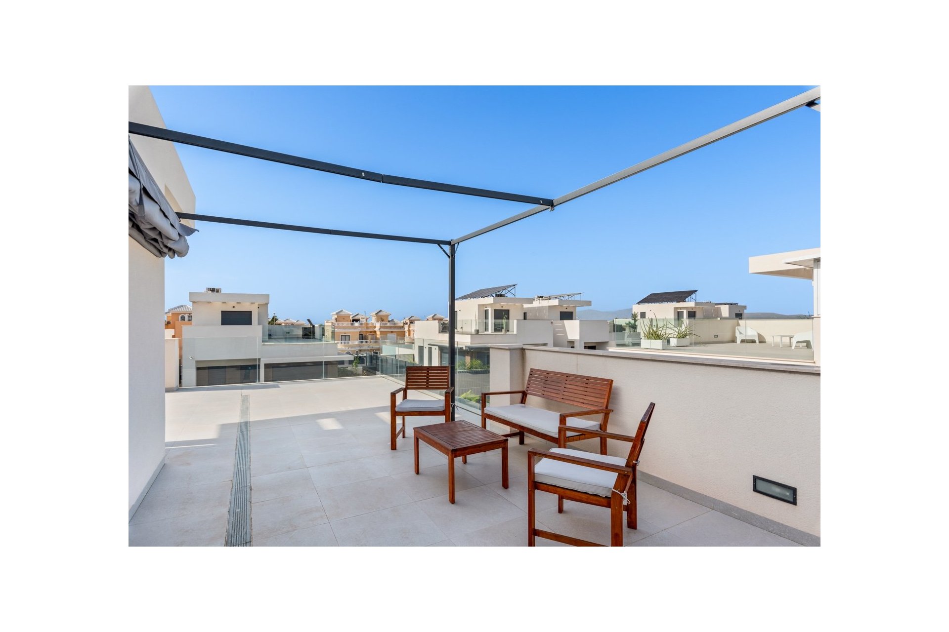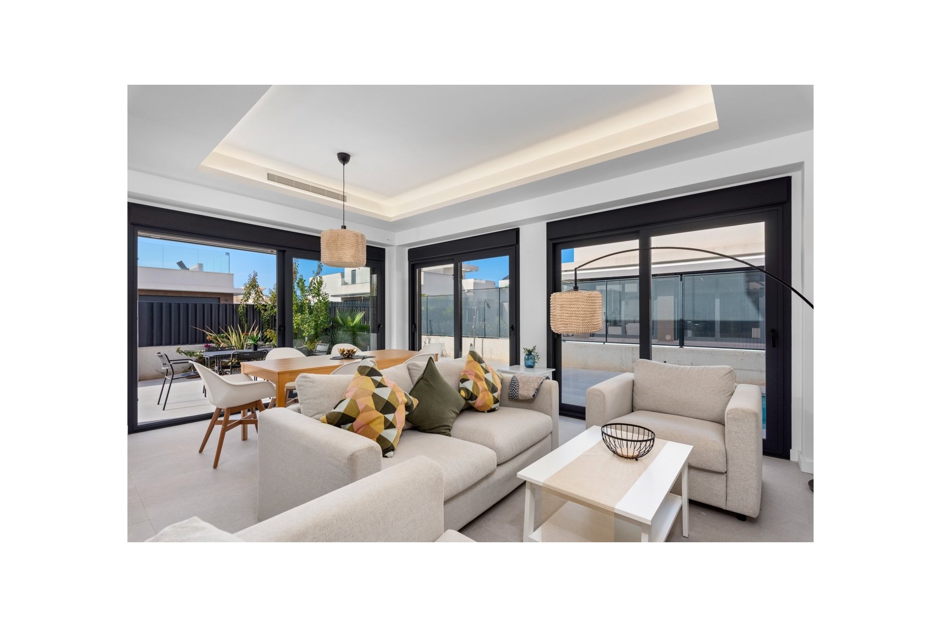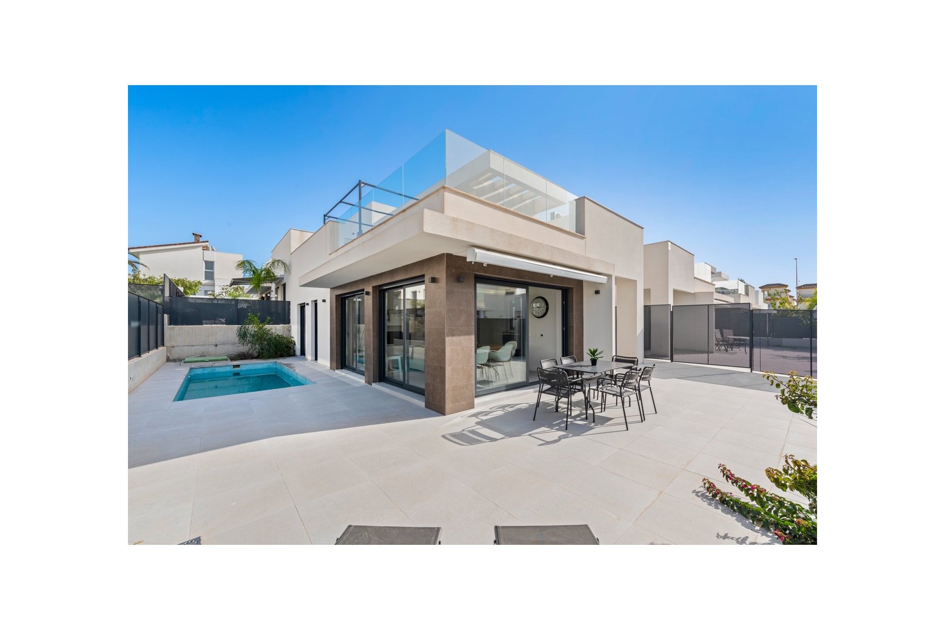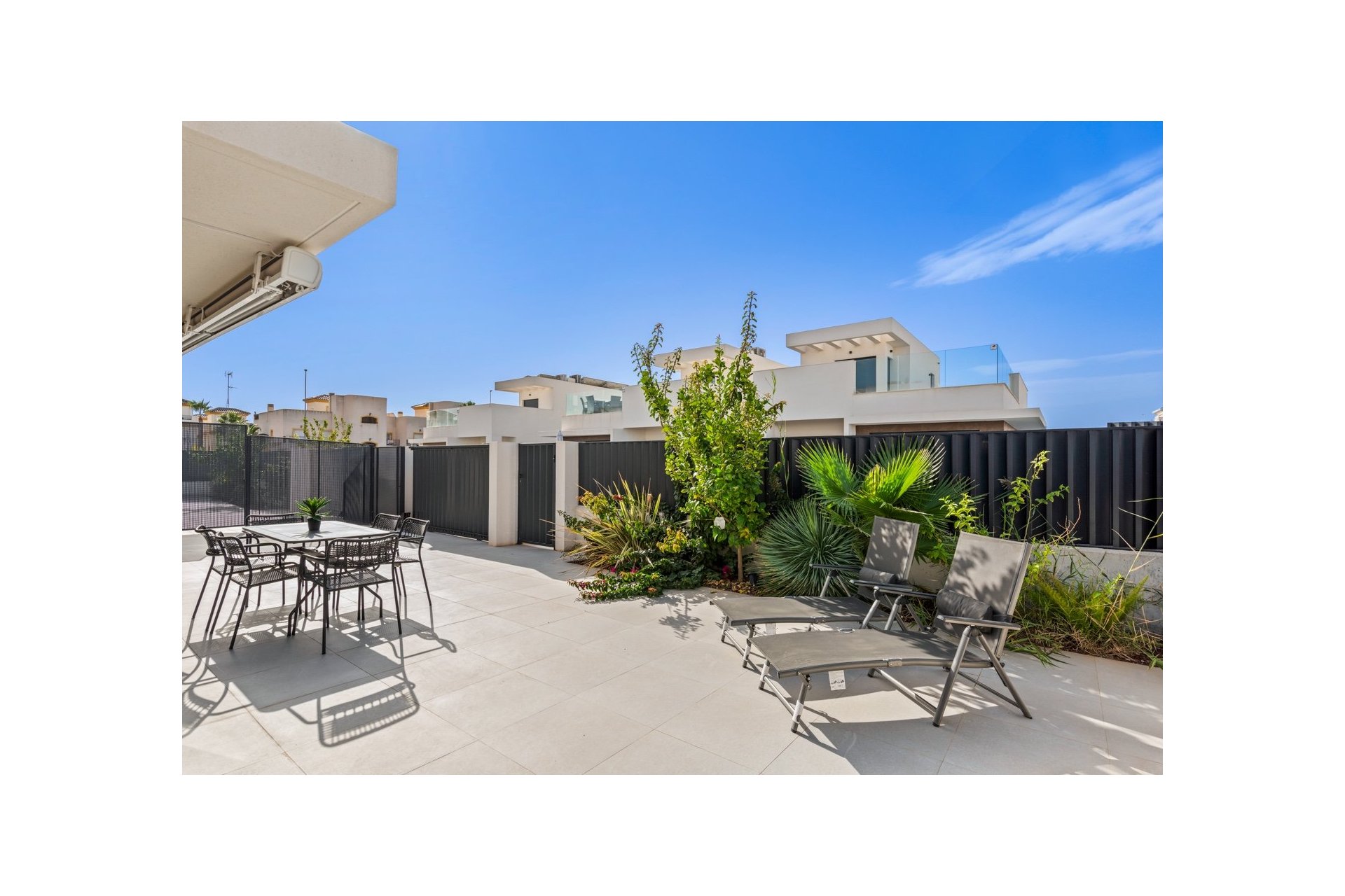 Nowoczesny dom w zabudowie bliźniaczej położony w spokojnej części San Fulgencio, na działce z prywatnym basenem i przestrzenią do wypoczynku na świeżym powietrzu. Dom został zaprojektowany tak, aby ogród stanowił naturalne przedłużenie strefy dziennej – duże przeszklenia zapewniają dużo światła i sprawiają, że wnętrza są jasne, przestronne i otwarte na otoczenie.