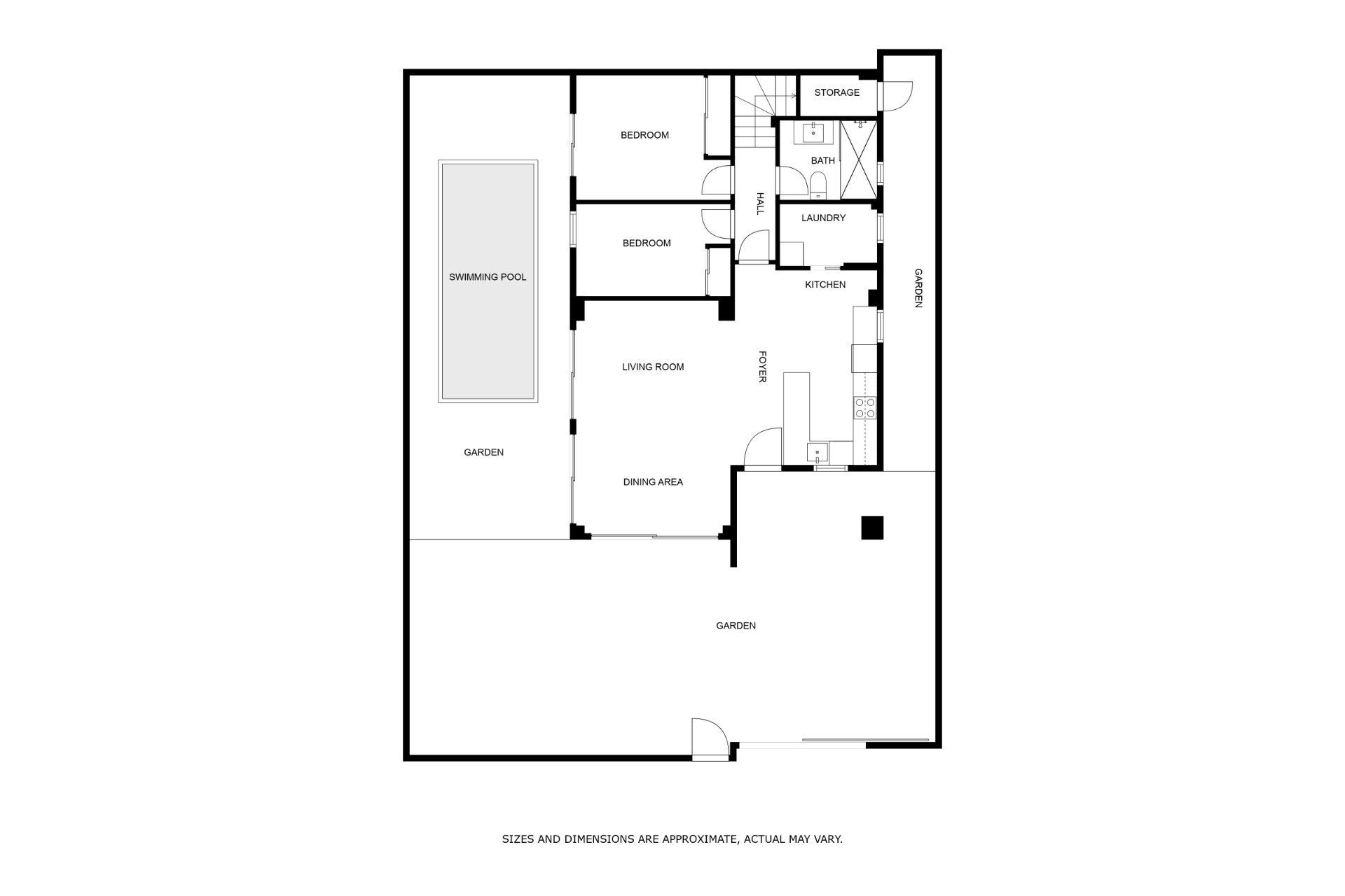 Parter obejmuje przestronny salon z aneksem kuchennym, z którego można bezpośrednio wyjść do ogrodu. Na tym poziomie znajdują się również dwie niezależne sypialnie, łazienka dostępna z korytarza oraz osobne pomieszczenie gospodarcze przeznaczone na pralnię i dodatkowe przechowywanie.